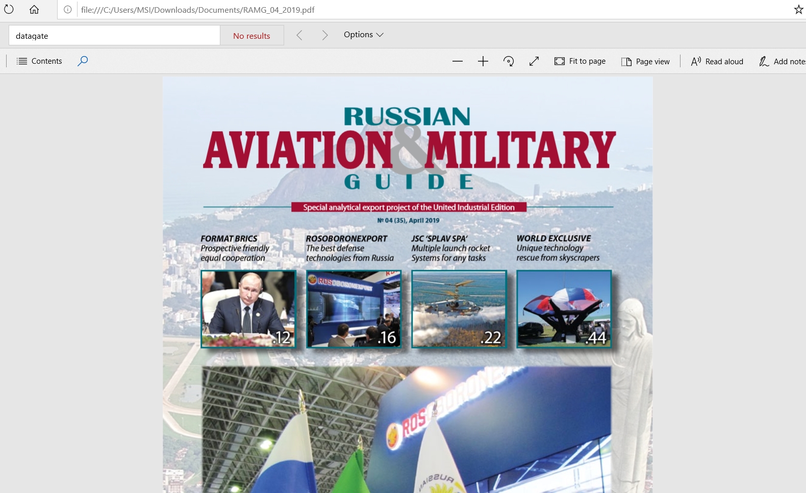 ในหน้าที่ 42 นำเสนอบทความชิ้นหนึ่ง ที่มีการกล่างอ้างถึงคำให้สัมภาษณ์ ของ นายอนาโตลี เซอดูคอฟ (Anatoly Serdyukov) ผู้อำนวยการฝ่ายกระจายสินค้าด้านอากาศยานบริษัท Rostecฯ รัฐวิสาหกิจด้านการส่งออกอาวุธของประเทศรัสเซีย เกี่ยวกับความร่วมมือในการขายสินค้าในประเทศไทย โดยมีการลงนาม บันทึกข้อตกลงความร่วมมือกับบริษัท ดาต้าเกท จำกัด ของไทยด้วย