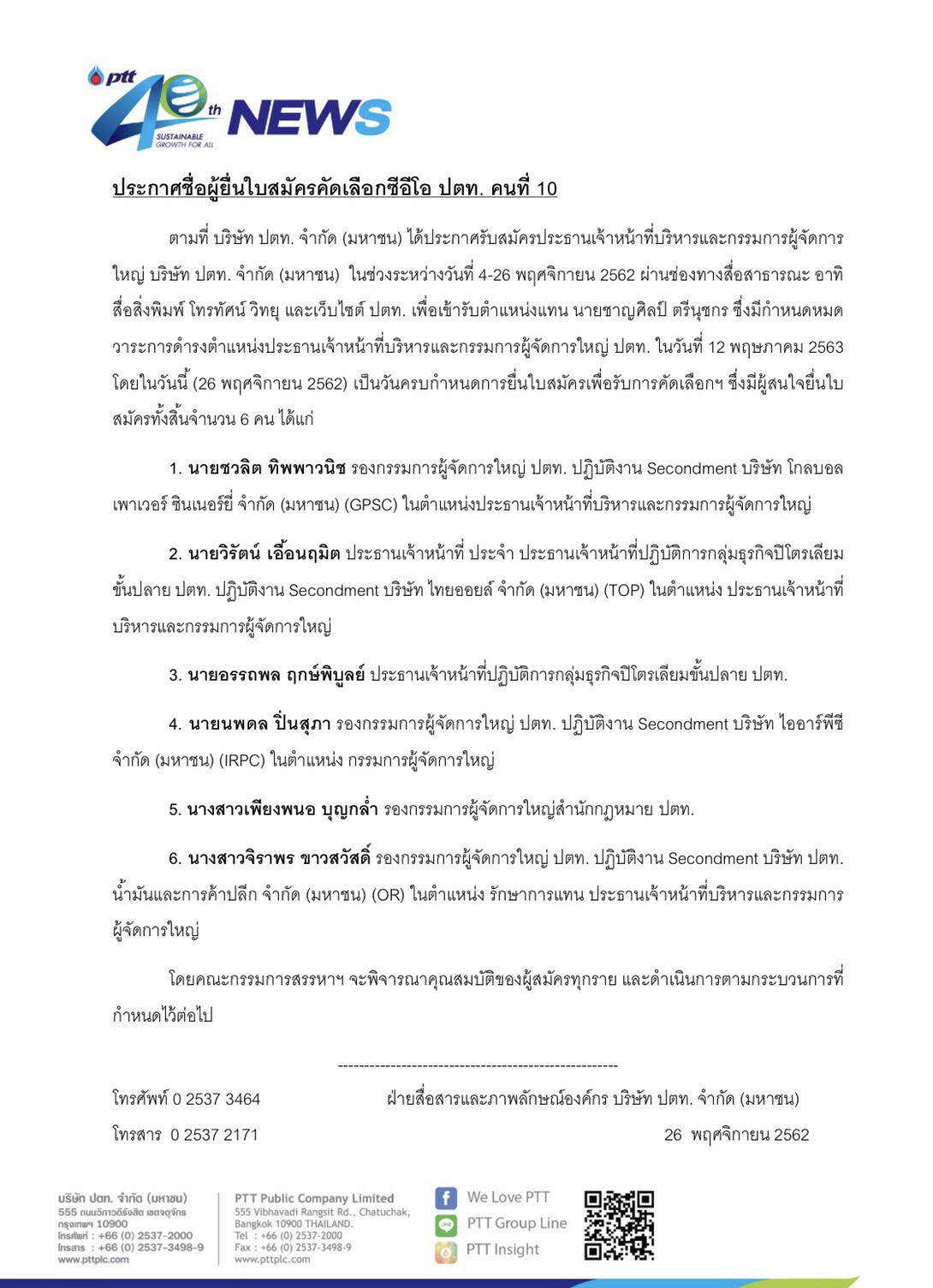 สำนักข่าวอิศรา www.isranews.org รายงานว่า เมื่อวันที่ 26 พ.ย.2562 ฝ่ายสื่อสารและภาพลักษณ์องค์กร บริษัท ปตท. จำกัด (มหาชน) ได้เผยแพร่ข่าวประชาสัมพันธ์ ประกาศชื่อผู้ยื่นใบสมัครคัดเลือกซีอีโอ ปตท. คนที่ 10