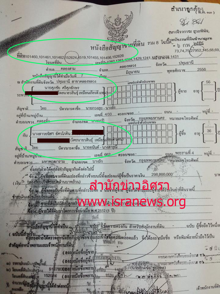 โดยตกลงราคาซื้อขายกันเป็นเงิน 298 ล้านบาท ระบุว่าผู้ซื้อได้ชำระเงินค่าที่ดินให้ผู้ขายเสร็จเรียบร้อยแล้ว โดยที่ดินทั้งหมด ไม่มีสิ่งปลูกสร้าง ไม่มีการเช่า ไม่ค้างชำระภาษีบำรุงท้องที่