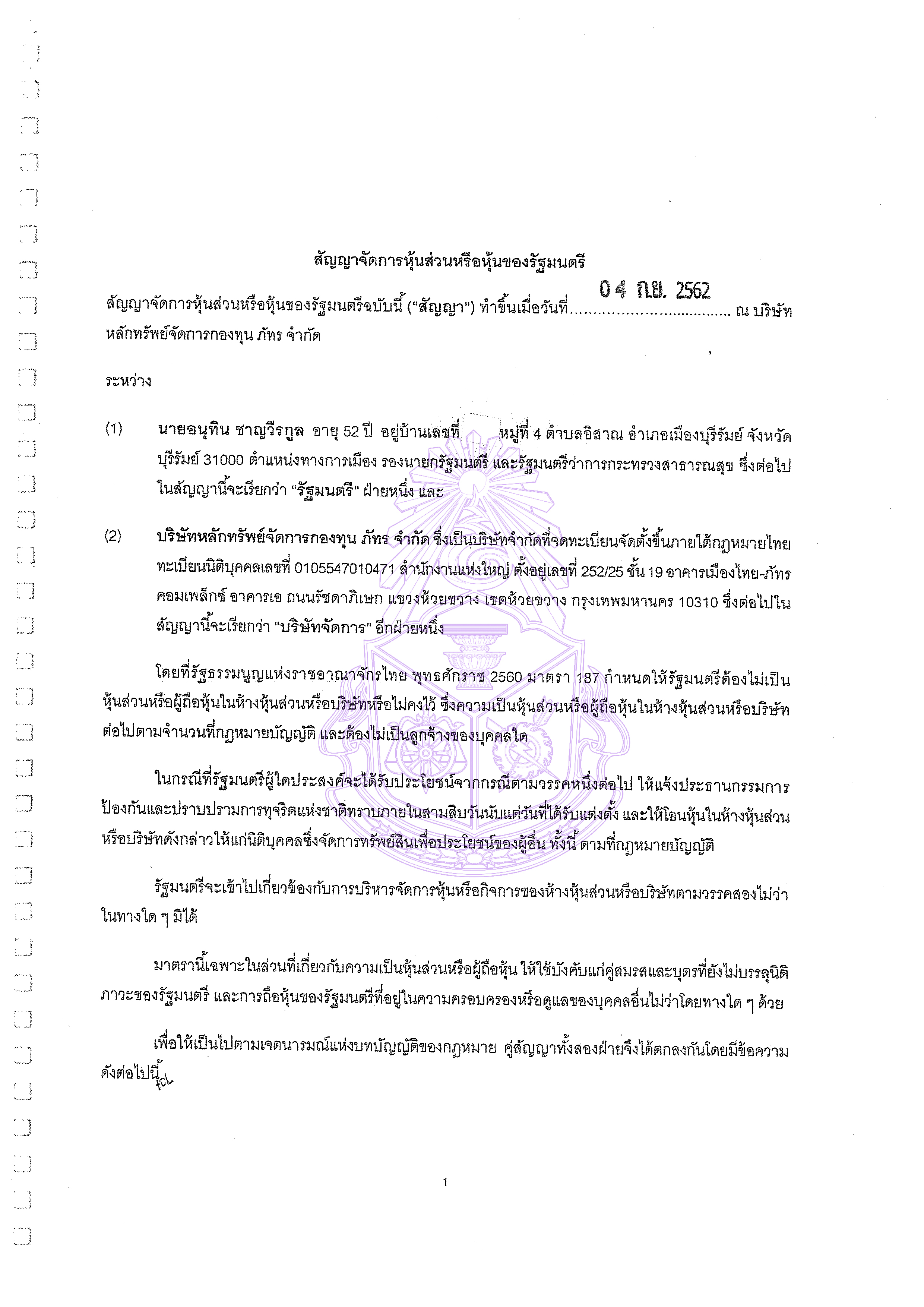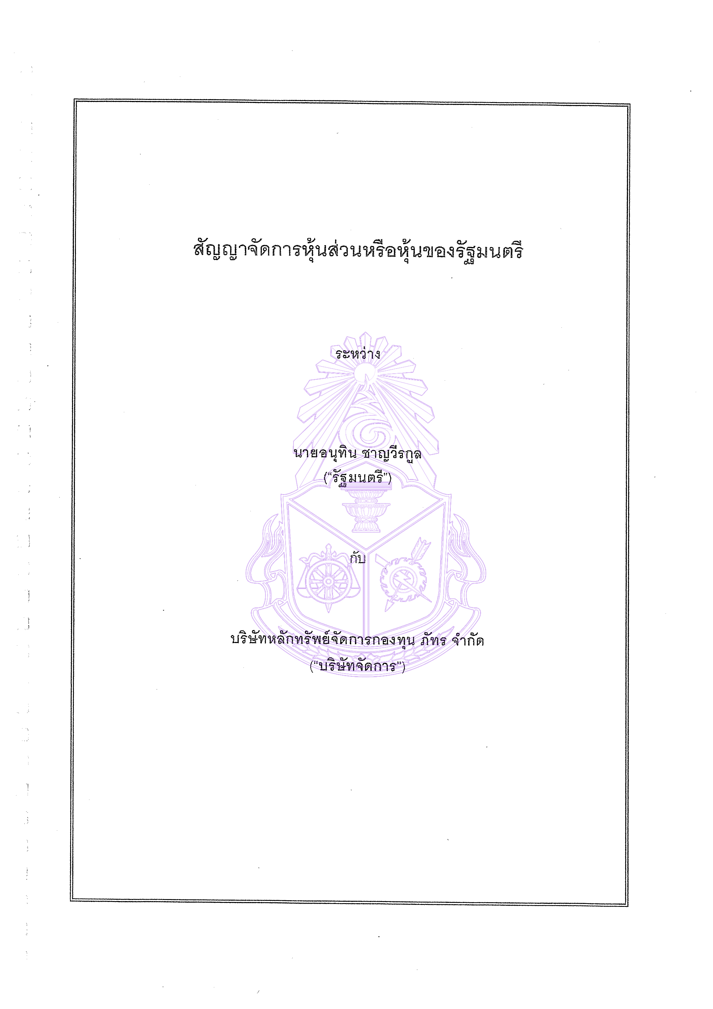 โดยสำเนาสัญญาการจัดการหุ้นส่วนหรือหุ้นดังกล่าว จัดทำขึ้นระหว่าง นายอนุทิน ชาญวีรกูล (รัฐมนตรี) กับ บริษัท หลักทรัพย์จัดการกองทุน ภัทร (บริษัทจัดการ) มีจำนวน 8 หน้า เอกสารแนบ 7 หน้า และเอกสารคำอธิบายประกอบการขอความยินยอมการลงทุนในหน่วยลงทุนของกองทุนรวมที่บริษัทจัดการเป็นผู้รับผิดชอบดำเนินการ 11 หน้า รวมเป็น 26 หน้า แต่ไม่อนุญาตให้สื่อมวลชนถ่ายภาพเอกสาร (อ่านประกอบ : ป.ป.ช.โชว์สัญญา 'อนุทิน' โอน 'STPI' 164 ล้านหุ้น ให้ บลจ.ภัทร จัดการ-ขอรับปย.ถือเกิน 5%)