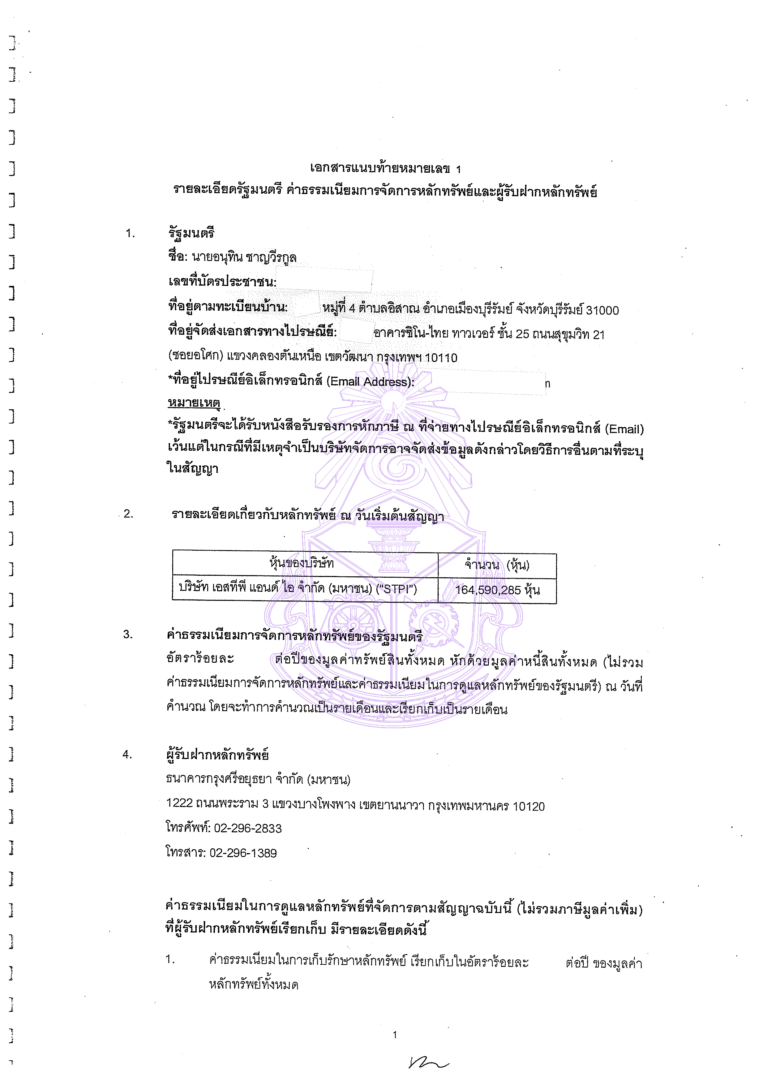 ป.ป.ช.โชว์หน้าเว็บสัญญา 'อนุทิน' โอน 'STPI' 164 ล้านหุ้น ให้ บลจ.ภัทร จัดการ-ขอรับปย.ถือเกิน 5% ระบุสิ้นสุดข้อตกลง 2 กรณี ความเป็นรัฐมนตรียุติ- บ.เลิกกิจการ/ล้มละลาย ไม่โชว์ตัวเลขค่าธรรมเนียมเก็บรักษาทรัพย์ อัตราร้อยละเท่าไร ต่อปี