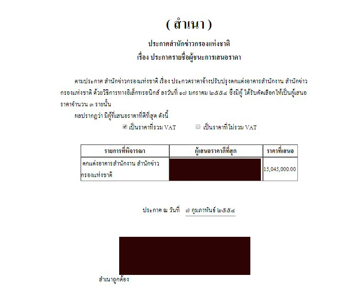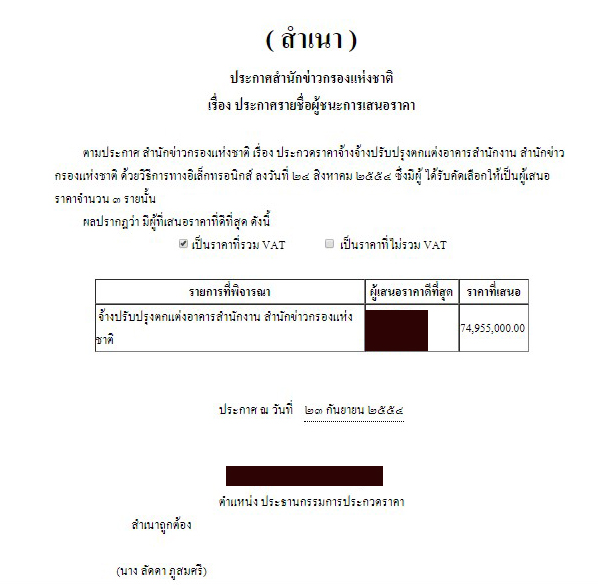 ขณะที่สำนักข่าวอิศรา ตรวจสอบฐานข้อมูลจัดซื้อจัดจ้างหน่วยงานภาครัฐ พบว่า ในช่วงปี 2554 สำนักข่าวกรองแห่งชาติ จัดทำโครงการจ้างปรับปรุงตกแต่งอาคาร จำนวน 2 สัญญา แยกเป็นสัญญาแรก วงเงิน 15,100,000 บาท ประกาศผลเมื่อวันที่ 7 ก.พ.2554 บริษัท อ. (ตัวย่อ) เป็นผู้ชนะ สัญญาสอง วงเงิน 75,500,000 บาท ประกาศผลเมื่อวันที่ 23 ก.ย.2554 บริษัท ย. (ตัวย่อ) เป็นผู้ชนะ แต่ในฐานข้อมูลไม่เปิดเผยรายละเอียดว่ามีบริษัทเอกชนรายใดบ้างเข้ามาแข่งขันงาน