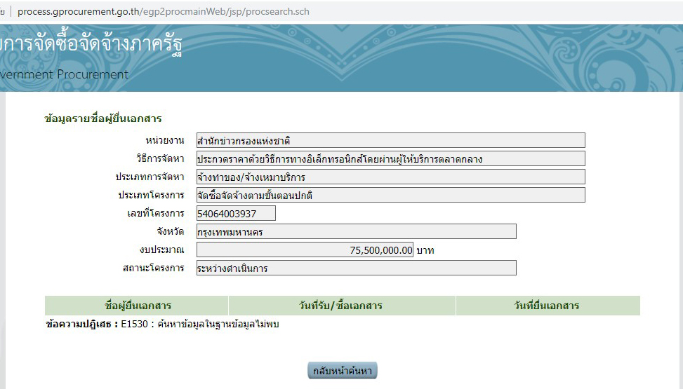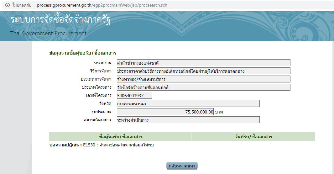 ส่วนข้อมูลข้อมูลรายชื่อผู้ขอรับ/ซื้อเอกสาร , ข้อมูลรายชื่อผู้ยื่นเอกสาร , ข้อมูลรายชื่อผู้ผ่านการพิจารณาคุณสมบัติและเทคนิค และข้อมูลการเสนอราคา ไม่สามารถดูได้ ระบุแค่ว่า "ข้อความปฎิเสธ : E1530 : ค้นหาข้อมูลในฐานข้อมูลไม่พบ"