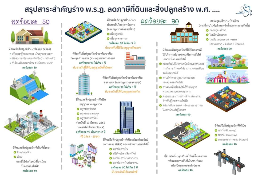 1.1 กำหนดให้ลดภาษีที่ดินหรือสิ่งปลูกสร้างร้อยละ 50 ดังต่อไปนี้