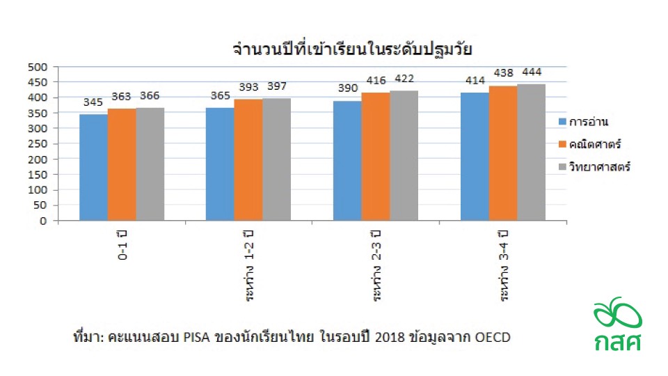 ขณะที่ดร.ภูมิศรัณย์ ทองเลี่ยมนาค ผู้เชี่ยวชาญด้านเศรษฐศาสตร์การศึกษา กสศ. กล่าวถึงการเก็บข้อมูลขององค์กร OECD ผ่านทางการทดสอบ PISA ที่ผ่านมาในปี 2018 และ 2015 พบว่า ประเทศที่เยาวชนกลุ่มอายุ 15 ปี สามารถทำคะแนนได้ดี มีความสัมพันธ์อย่างมีนัยสำคัญกับจำนวนปีที่ใช้ในการเข้าเรียนในระดับปฐมวัย