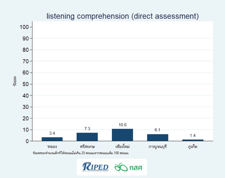 "ประเด็นนี้น่าจะบ่งบอกว่า เด็กที่เกิดในครอบครัวที่ขาดโอกาสมักจะมีพัฒนาการที่ช้า นอกจากนี้ หากเราให้ความสำคัญกับจำนวนเด็กหางแถว (เด็กที่มีระดับคะแนนไม่ถึงร้อยละ 25 ของคะแนนเต็ม) ในแต่ละพื้นที่มากกว่าระดับคะแนนเฉลี่ย พบว่า มีเด็กปฐมวัยบางส่วนที่มีระดับความพร้อมด้านความเข้าใจในการฟังค่อนข้างต่ำ (มีระดับคะแนนไม่ถึงร้อยละ 25 ของคะแนนเต็ม) ซึ่งจังหวัดที่มีปัญหาส่วนนี้ค่อนข้างมากคือ เชียงใหม่ ร้อยละ 10.6 ศรีสะเกษ ร้อยละ 7.3 กาญจนบุรี ร้อยละ 6.1 ส่วนระยองและภูเก็ต มีปัญหานี้เพียงเล็กน้อย ร้อยละ 3.4 และ ร้อยละ 1.4 ตามลำดับ"