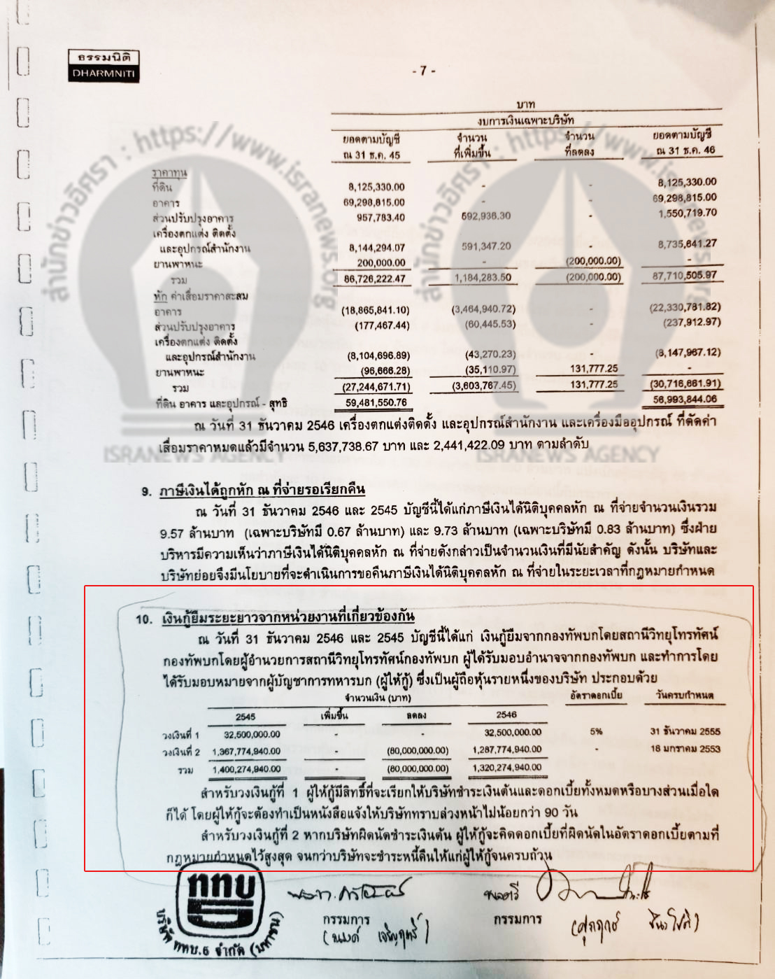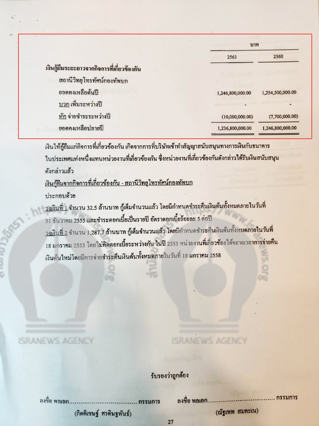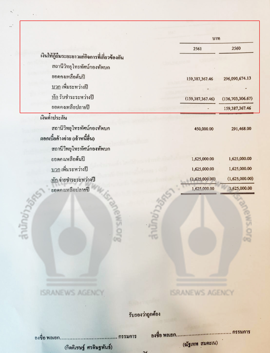 อย่างไรก็ดี บริษัทฯ ได้แจ้งข้อมูลในส่วนเงินให้กู้ยืมระยะยาว ว่า บริษัทฯ ได้ให้ สถานีวิทยุโทรทัศน์กองทัพบก กู้ยืมไปเป็นจำนวน 1,536,298,000 บาท