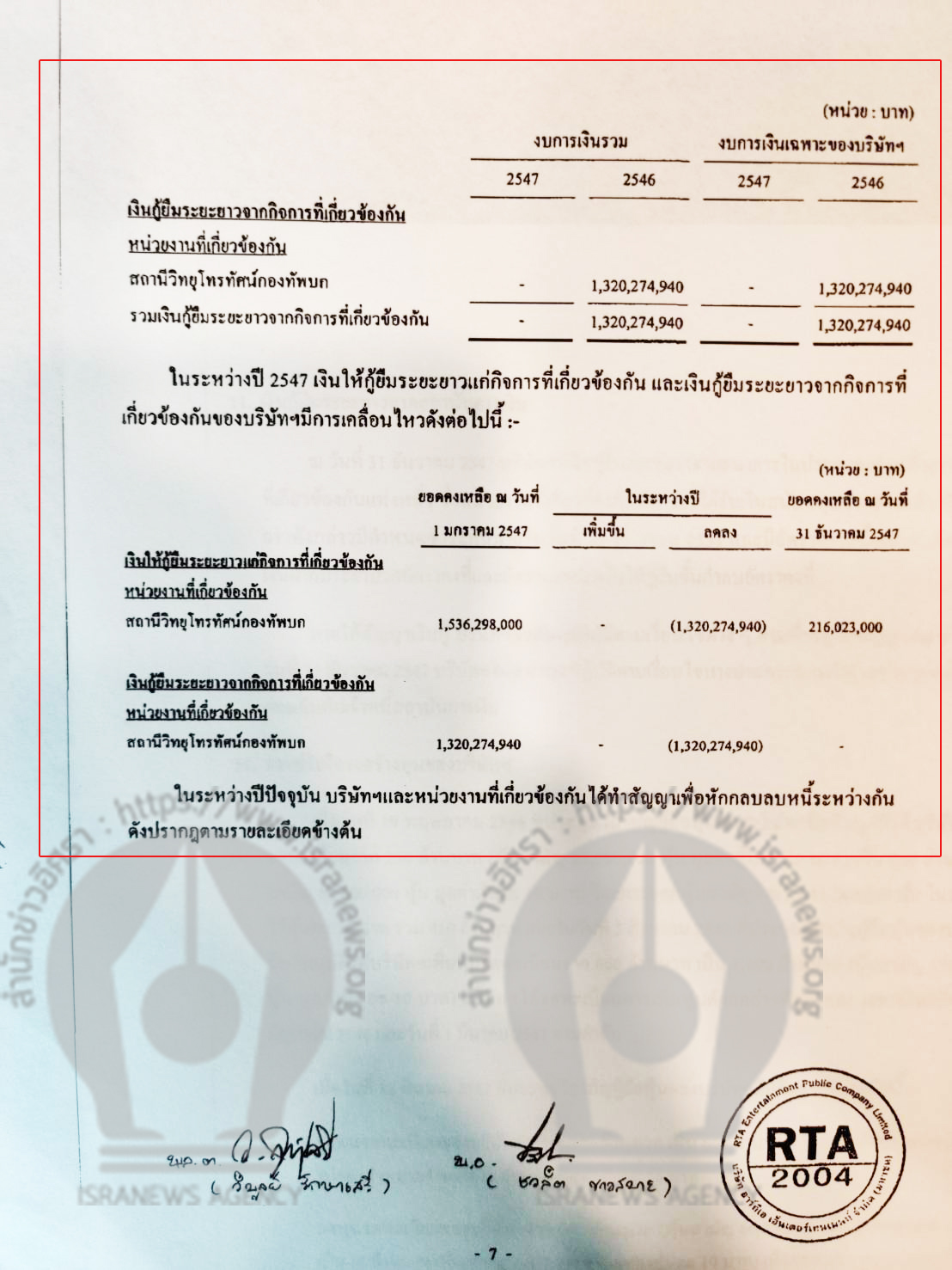 "...สำนักข่าวอิศรา www.isranews.org ตรวจสอบงบการเงิน บริษัท อาร์ทีเอ เอ็นเตอร์เทนเมนท์ จำกัด (มหาชน)ที่แจ้งไว้กับกรมพัฒนาธุรกิจการค้า พบข้อมูลเกี่ยวกับที่มาเงินกู้ยืมระยะยาว 1,236,800,000 บาท ว่า เป็นเงินที่ บริษัท อาร์ทีเอ เอ็นเตอร์เทนเมนท์ จำกัด (มหาชน) กู้ยืมมาจากกองทัพบก ผ่านสถานีวิทยุโทรทัศน์กองทัพบก โดยได้รับมอบหมายจาก ผู้บัญชาการทหารบก ในฐานะผู้ให้กู้..."
