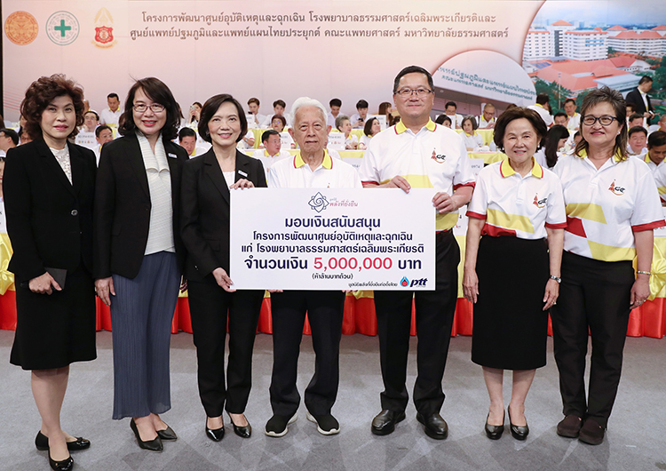 เมื่อเร็วๆ นี้ นางสาวดวงพร เที่ยงวัฒนธรรม รองกรรมการผู้จัดการใหญ่ กำกับดูแลองค์กรและกิจการสัมพันธ์ (ที่ 3 จากซ้าย) นางปิยดา จงพยุหะ ผู้ช่วยกรรมการผู้จัดการใหญ่ บริหารชื่อเสียงองค์กรและกิจการเพื่อสังคม ปตท. (ที่ 2 จากซ้าย) และผู้แทนมูลนิธิพลังที่ยั่งยืน ซึ่งก่อตั้งโดย ปตท. มอบเงินสนับสนุนจำนวน 5 ล้านบาท เนื่องใน ‘วันธรรมศาสตร์’ แก่ ศาสตราจารย์พิเศษ นรนิติ เศรษฐบุตร นายกสภามหาวิทยาลัยธรรมศาสตร์ (กลาง) และนายชาญศิลป์ ตรีนุชกร นายกสมาคมธรรมศาสตร์ ในพระบรมราชูปถัมภ์ (ที่ 3 จากขวา) เพื่อร่วมดำเนินโครงการพัฒนาศูนย์อุบัติเหตุและฉุกเฉิน แก่โรงพยาบาลธรรมศาสตร์เฉลิมพระเกียรติ