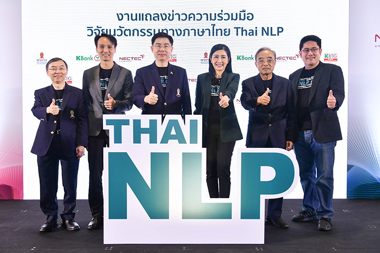 นางสาวขัตติยา อินทรวิชัย (ที่ 3 จากขวา) กรรมการผู้จัดการ ธนาคารกสิกรไทย ศ.ดร.บัณฑิต เอื้ออาภรณ์ (ที่ 3 จากซ้าย) อธิการบดีจุฬาลงกรณ์มหาวิทยาลัย และดร.ชัย วุฒิวิวัฒน์ชัย (ที่ 2 จากซ้าย) ผู้อำนวยการศูนย์เทคโนโลยีอิเล็กทรอนิกส์และคอมพิวเตอร์แห่งชาติ ร่วมแถลงข่าวความร่วมมือวิจัยนวัตกรรมทางภาษาไทย Thai NLP ในส่วนของภาษาทางการเงินการธนาคารและธุรกิจ สร้างความสามารถให้คอมพิวเตอร์ทำความเข้าใจข้อความที่ลูกค้าพิมพ์เข้ามาในระบบต่าง ๆ เพื่อให้บริการและตอบคำถามลูกค้าโดยแชทบอทบนช่องทางโซเชียลมีเดีย มีความถูกต้อง แม่นยำ และรวดเร็ว เพื่อนำมาพัฒนาผลิตภัณฑ์หรือบริการที่สามารถตอบสนองลูกค้าได้อย่างตรงเป้าหมาย สร้างความพึงพอใจสูงสุดให้แก่ลูกค้า และหวังเป็นต้นแบบให้หน่วยงานรัฐหรือเอกชนนำไปประยุกต์ใช้ให้เกิดประโยชน์สูงสุดกับประเทศชาติ ณ โรงละครเคแบงก์สยามพิฆเนศ สยามสแควร์วัน เมื่อเร็วๆ นี้