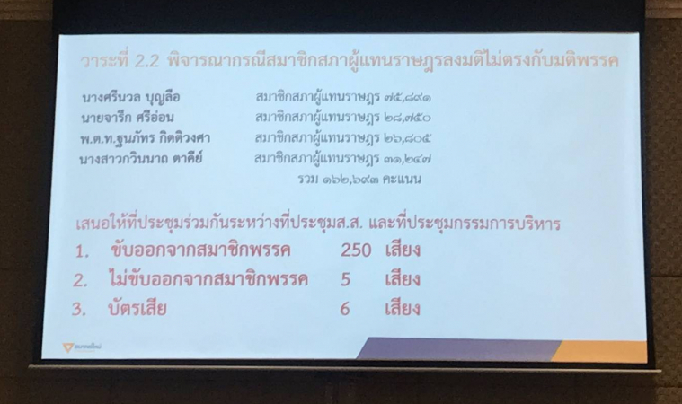 มติที่ประชุมสมาชิก อนค.ข้างมาก 250 เสียงขับ 4 ‘ส.ส.งูเห่า’พ้นพรรค