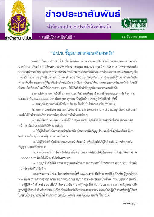 สืบเนื่องจากปรากฎข่าวว่า เมื่อวันที่ 18 ธ.ค. 2562 ที่ผ่านมา คณะกรรมการป้องกันและปราบปรามการทุจริตแห่งชาติ (ป.ป.ช.) ได้มีมติชี้มูลความผิดนายอภิชิต วิโนทัย นายกเทศมนตรีนครตรัง นายปัญญา ภิรมย์ รองปลัดเทศบาลนครตรัง และนายสุพร หรือกรธวัฒน์ ตุลาธน ผู้รับเหมา กรณีถูกกล่าวหาว่า ทุจริตดำเนินการจ้างเหมาจัดงานเทศกาลตรุษจีนนครตรัง โครงการอนุรักษ์สืบสานส่งเสริมเอกลักษณ์จารีตประเพณีท้องถิ่น ประจำปี 2556 ในการยินยอมให้ผู้รับจ้างเรียกเก็บเงินค่าเช่าพื้นที่ขายของจากผู้ที่มาเปิดร้านโดยไม่มีการนำเงินส่งเป็นรายได้ของเทศบาลนครตรังและจัดจ้างโดยวิธีพิเศษ เพื่อเอื้อประโยชน์ให้กับนายสุพร หรือกรธวัฒน์ ตุลาธน ได้มีสิทธิเข้าทำสัญญากับเทศบาลนครตรัง (อ่านประกอบ: ป.ป.ช.ฟันนายกเทศมนตรีนครตรัง-พวก จัดงานตรุษจีนปี 56 เอื้อเอกชน)