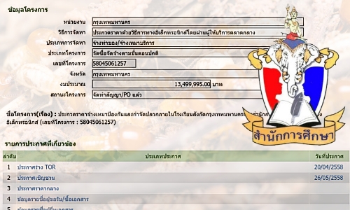 พบว่า งานโครงการนี้ สำนักการศึกษา กรุงเทพมหานคร ดำเนินการในชื่อโครงการ "ประกวดราคาจ้างเหมาป้องกันและกำจัดปลวกภายในโรงเรียนสังกัดกรุงเทพมหานครและสำนักการศึกษา" (เลขที่โครงการ : 58045061257)