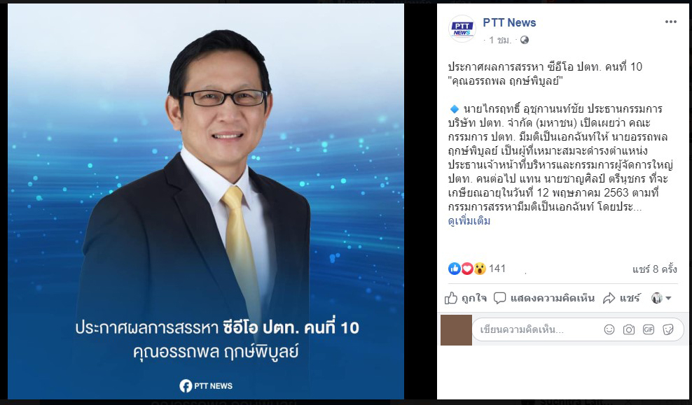 โดยอ้างคำให้สัมภาษณ์ของ นายไกรฤทธิ์ อุชุกานนท์ชัย ประธานกรรมการ บริษัท ปตท. จำกัด (มหาชน) ระบุว่า คณะกรรมการ ปตท. มีมติเป็นเอกฉันท์ให้ นายอรรถพล ฤกษ์พิบูลย์ เป็นผู้ที่เหมาะสมจะดำรงตำแหน่ง ประธานเจ้าหน้าที่บริหารและกรรมการผู้จัดการใหญ่ ปตท. คนต่อไป แทน นายชาญศิลป์ ตรีนุชกร ที่จะเกษียณอายุในวันที่ 12 พฤษภาคม 2563 ตามที่กรรมการสรรหามีมติเป็นเอกฉันท์ โดยประธานเจ้าหน้าที่บริหารและกรรมการผู้จัดการใหญ่ ปตท. คนใหม่ จะเริ่มปฏิบัติงานบริหารการดำเนินงาน ตั้งแต่วันที่ 13 พฤษภาคม 2563 เป็นต้นไป