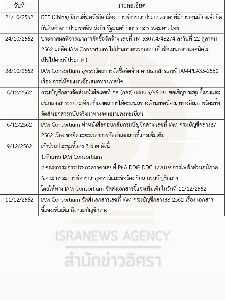 -วันที่ 2 ต.ค. 2562 IAM Consortium จัดทําหนังสือ เลขที่ IAM-PEA32-2562 เรื่อง ขอให้กํากับดูแลการพิจารณาประกวดราคาไม่ให้มีการเอนเอียงในการให้ คะแนน สูง ถึง ผู้ว่าการการไฟฟ้าส่วนภูมิภาค