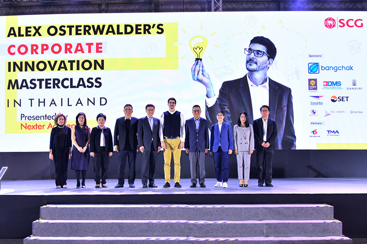 เอสซีจี โดย Nexter Academy (เน็กซ์เตอร์ อะคาเดมี) หน่วยงานด้านนวัตกรรมองค์กรและขับเคลื่อนการเติบโตธุรกิจใหม่ ภายใต้ธุรกิจซีเมนต์และผลิตภัณฑ์ก่อสร้าง จัดเวิร์กช็อปสร้างสรรค์นวัตกรรมในองค์กร “Alex Osterwalder’s Corporate Innovation Masterclass in Thailand” โดย อเล็กซ์ ออสเทอร์วัลเดอร์ (ที่ 5 จากขวา) นักคิดด้านการบริหารจัดการและโมเดลธุรกิจที่ได้รับการยอมรับระดับโลก ซึ่งได้รับเสียงตอบรับที่ดีจากผู้ร่วมงาน โดยมี นายรุ่งโรจน์ รังสิโยภาส กรรมการผู้จัดการใหญ่ เอสซีจี (ที่ 4 จากขวา) ร่วมงาน พร้อมพันธมิตรองค์กรนวัตกรรมผู้ร่วมสนับสนุนการจัดงาน ได้แก่ บางจาก กรุงศรี BDMS แสนสิริ ไปรษณีย์ไทย ตลาดหลักทรัพย์แห่งประเทศไทย อสมท TCC Assets DeOne International มหาวิทยาลัยหอการค้าไทย Techsauce และ TMA เมื่อเร็วๆ นี้ ณ สามย่านมิตรทาวน์