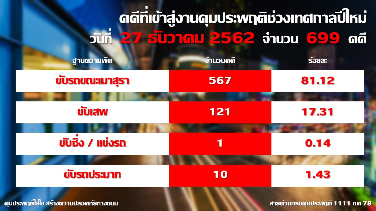 ขณะที่ศาลยุติธรรม สรุปรายงานข้อมูลสถิติคดีความผิดตามพระราชบัญญัติจราจรทางบก พ.ศ. 2522 (7วันอันตราย) ประจำวันที่ 27 ธันวาคม 2562