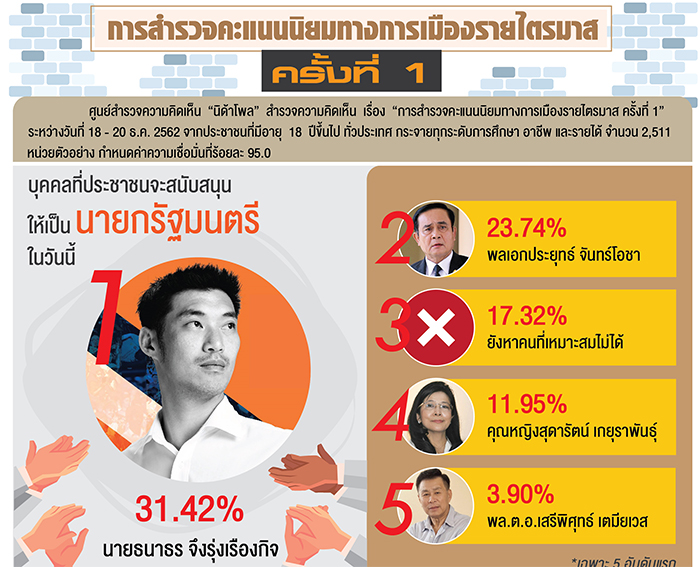 นิด้าโพลเผยบุคคลที่ประชาชนสนับสนุนให้เป็นนายกรัฐมนตรีในวันนี้ อันดับ 1 ร้อยละ 31.42 ระบุว่าเป็น นายธนาธร จึงรุ่งเรืองกิจ (พรรคอนาคตใหม่) อันดับ 2 ร้อยละ 23.74 ระบุว่าเป็น พลเอกประยุทธ์ จันทร์โอชา อันดับ 3 ร้อยละ 17.32 ระบุว่า ยังหาคนที่เหมาะสมไม่ได้ อันดับ 4 ร้อยละ 11.95 ระบุว่าเป็น คุณหญิงสุดารัตน์ เกยุราพันธุ์ และอันดับ 5 ร้อยละ 3.90 ระบุว่าเป็น พล.ต.อ.เสรีพิศุทธ์ เตมียเวส (พรรคเสรีรวมไทย)