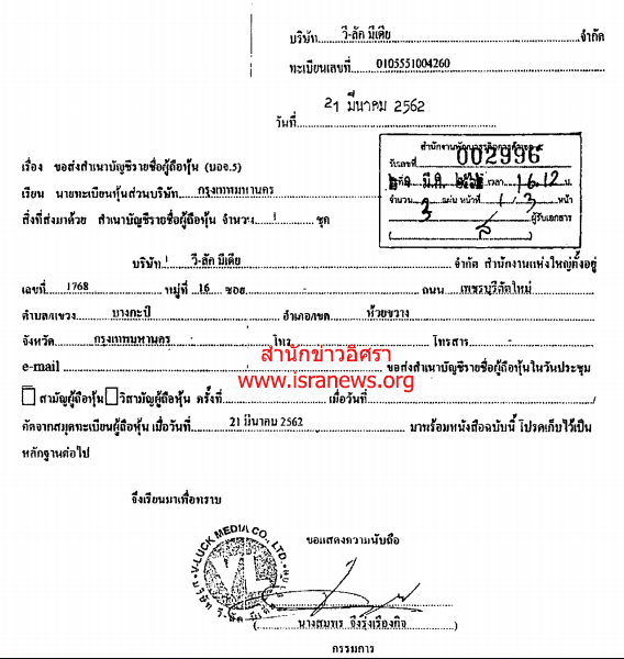 บ.วี-ลัค มีเดีย แจ้ง 22 มี.ค.62 ‘เมียธนาธร’ลาออก กก. - มี‘กก.ผู้ถือหุ้น’ร่วมประชุม 10 คน