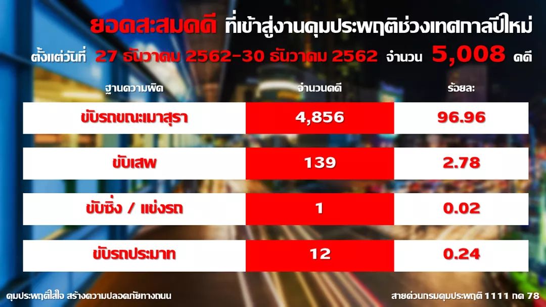 สำหรับยอดสะสมสถิติคดีที่ศาลสั่งคุมประพฤติ 4 วันที่มีการควบคุมเข้มงวด ระหว่างวันที่ 27-30 ธันวาคม 2562 มีจำนวนทั้งสิ้น 5,008 คดี จำแนกเป็นคดีขับรถขณะเมาสุรา จำนวน 4,856 คดี คิดเป็นร้อยละ 96.96