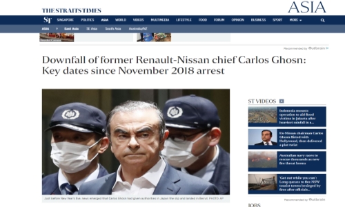 โดยสำนักข่าว Straits Times ของประเทศสิงคโปร์ ได้ทำรายงานพิเศษประมวลเหตุการณ์ไทม์ไลน์การจับกุม ก่อนการหลบหนีคดีของนายคาร์ลอสเอาไว้ ในหัวข้อเรื่องการล่มสลายของ คาร์ลอส โกส์น มีรายละเอียดดังนี้