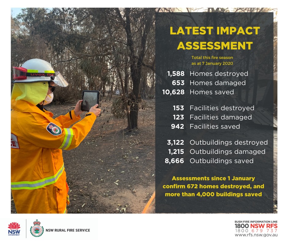 วันที่ 7 มกราคม New South Wales Rural Fire Service (RSF) หน่วยงานที่มีหน้าที่ดับไฟป่า ประเมินผลกระทบที่เกิดจากวิกฤติไฟป่ารุนแรงที่สุดในประวัติศาสตร์ โดย RSF รายงานว่า มีอาคารบ้านเรือนได้เสียหาย และได้รับผลกระทบจากไฟป่า แบ่งเป็น บ้าน 1,558 หลังถูกไฟป่าเผาทำลายเสียหาย และกว่า 20,000 หลังรอดจากไฟป่า