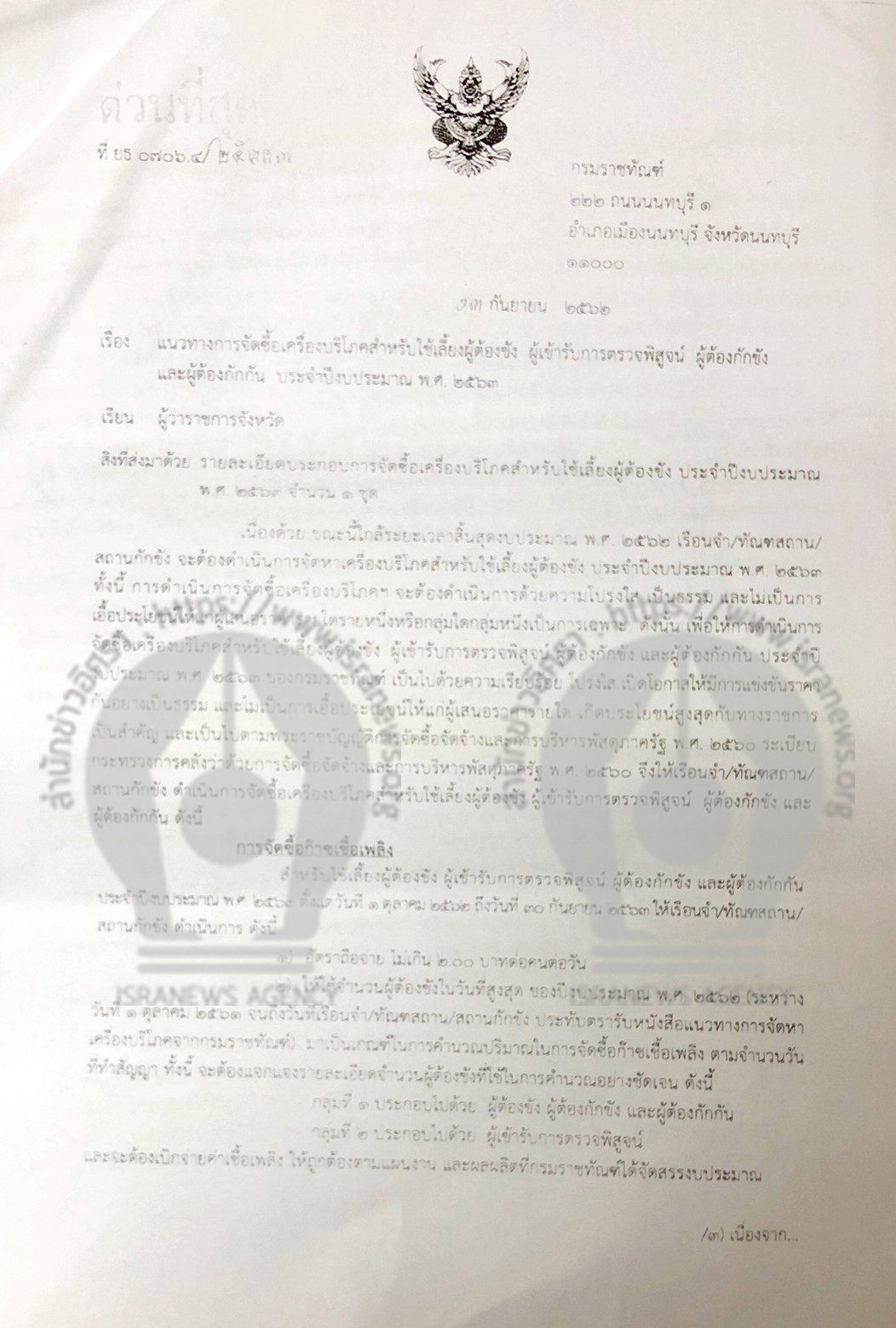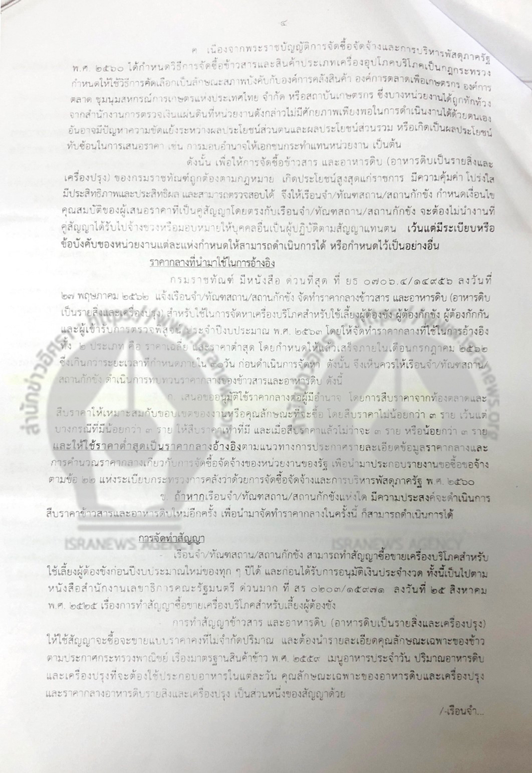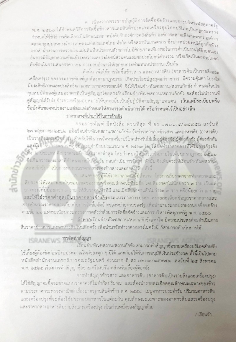 สำนักข่าวอิศรา www.isranews.org ได้รับการร้องเรียนว่า เมื่อวันที่ 13 ก.ย.2562 กรมราชทัณฑ์ โดย พ.ต.อ.ณรัชต์ เศวตนันทน์ อธิบดี ได้ทำหนังสือถึงผู้ว่าราชการจังหวัด กำหนดแนวทางการจัดซื้อเครื่องบริโภคสำหรับใช้เลี้ยงผู้ต้องขัง ผู้เข้ารับการตรวจพิสูจน์ ผู้ต้องกักขัง และผู้ต้องขัง ประจำปีงบประมาณ 2563 โดยกำหนดให้เรือนจำ/ทันฑสถาน/สถานกักขัง จัดซื้อข้าวสาร อาหารดิบ (อาหารดิบเป็นรายสิ่งและเครื่องปรุง) จากองค์การคลังสินค้า องค์การตลาดเพื่อเกษตรกร องค์การตลาด ชุมนุมสหกรณ์การเกษตรแห่งประเทศไทย จำกัด หรือ สถาบันเกษตรกรที่อยู่ในพื้นที่ใกล้ที่สุด โดยวิธีการคัดเลือก และแจ้งองค์การ ชุมนุม หรือ สถาบันเกษตรกรดังกล่าวเข้าเสนอราคาด้วย และดำเนินการตามขั้นตอนตามระเบียบกระทรวงการคลังว่าด้วยการจัดซื้อจัดจ้างและบริหารพัสดุภาครัฐพ.ศ.2560 ข้อ 74-77
