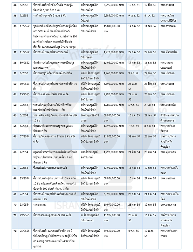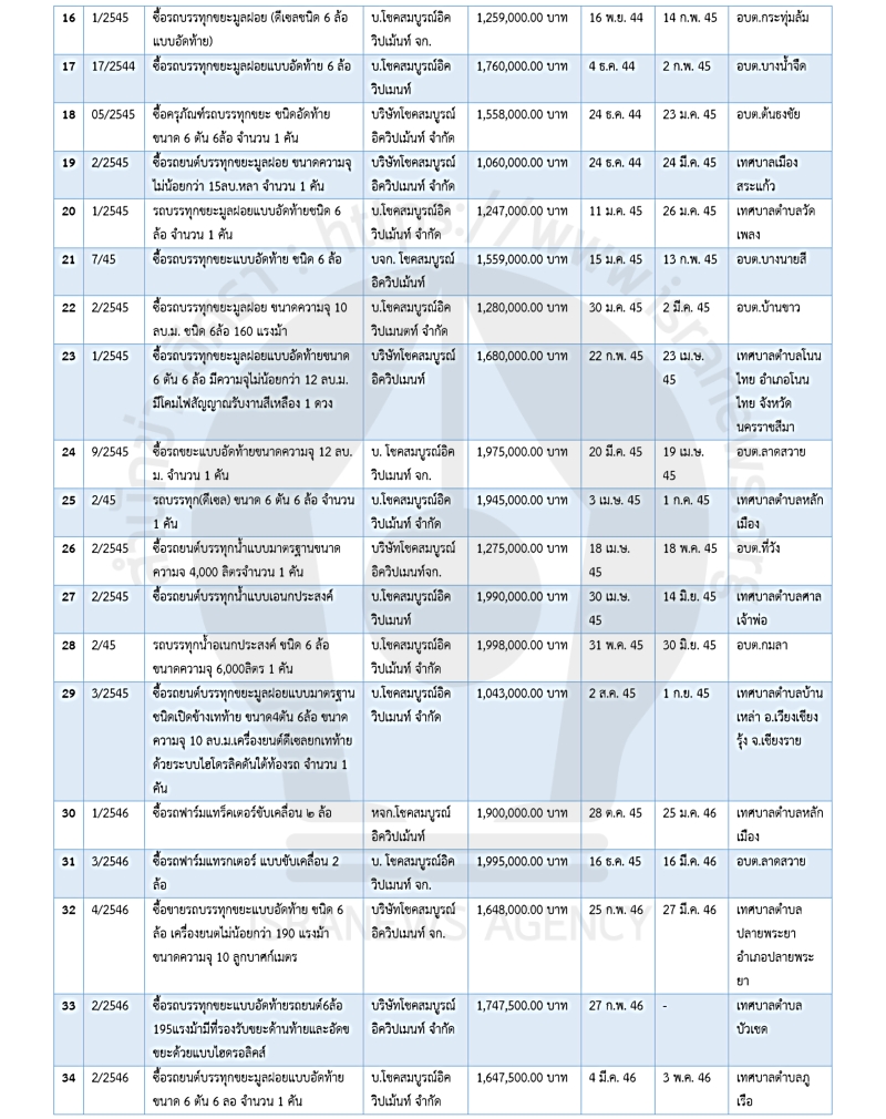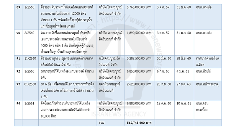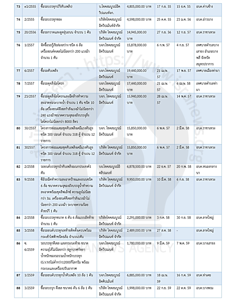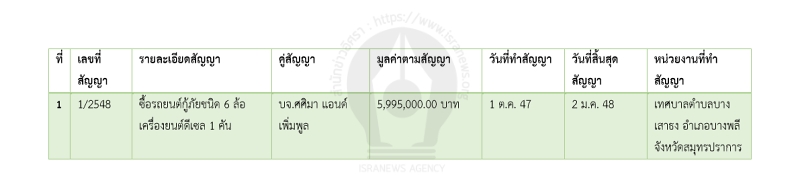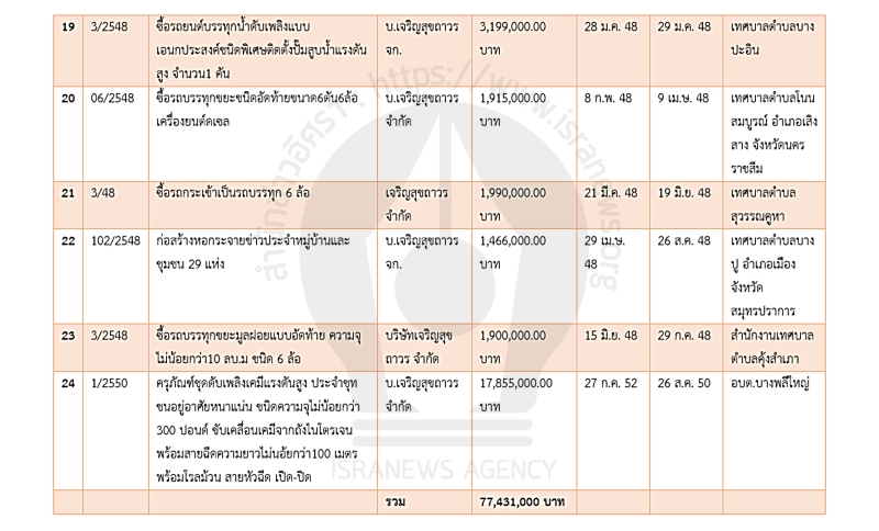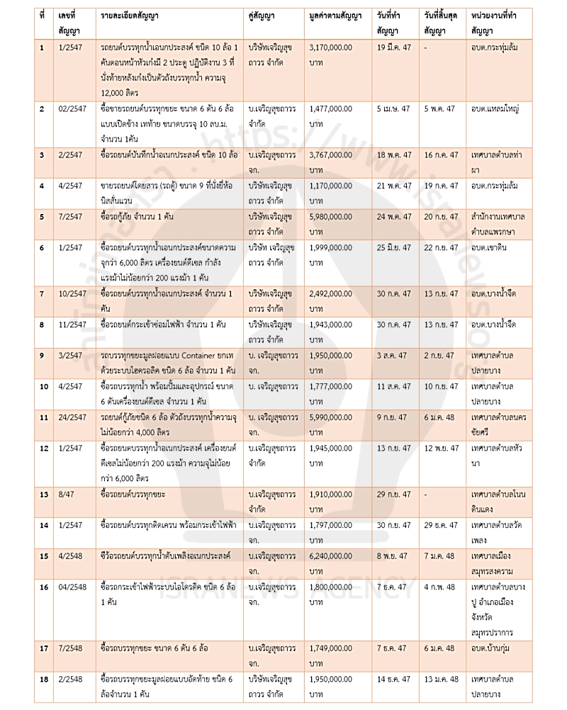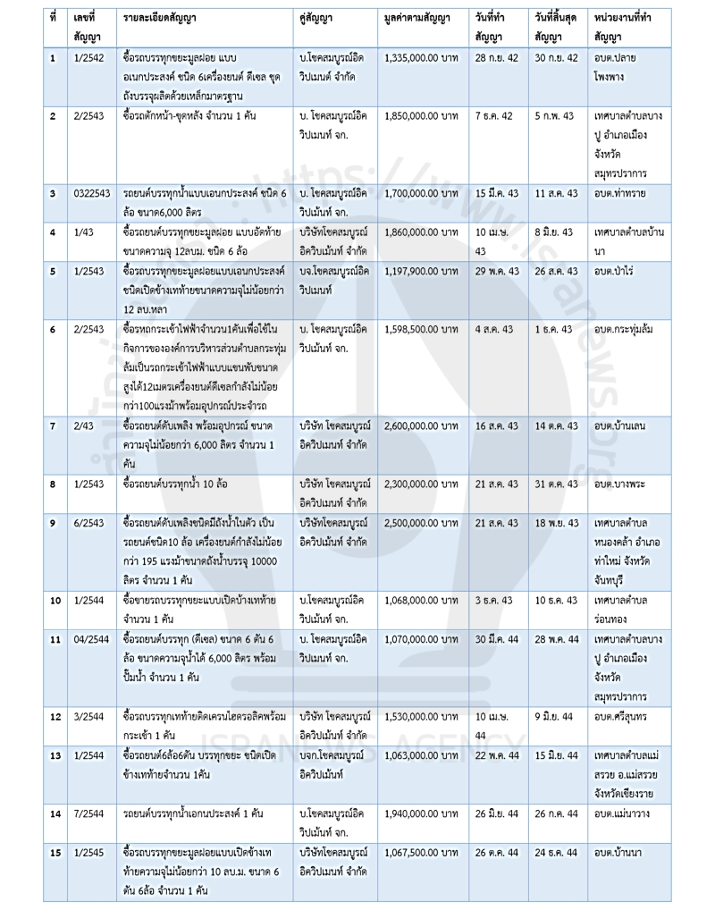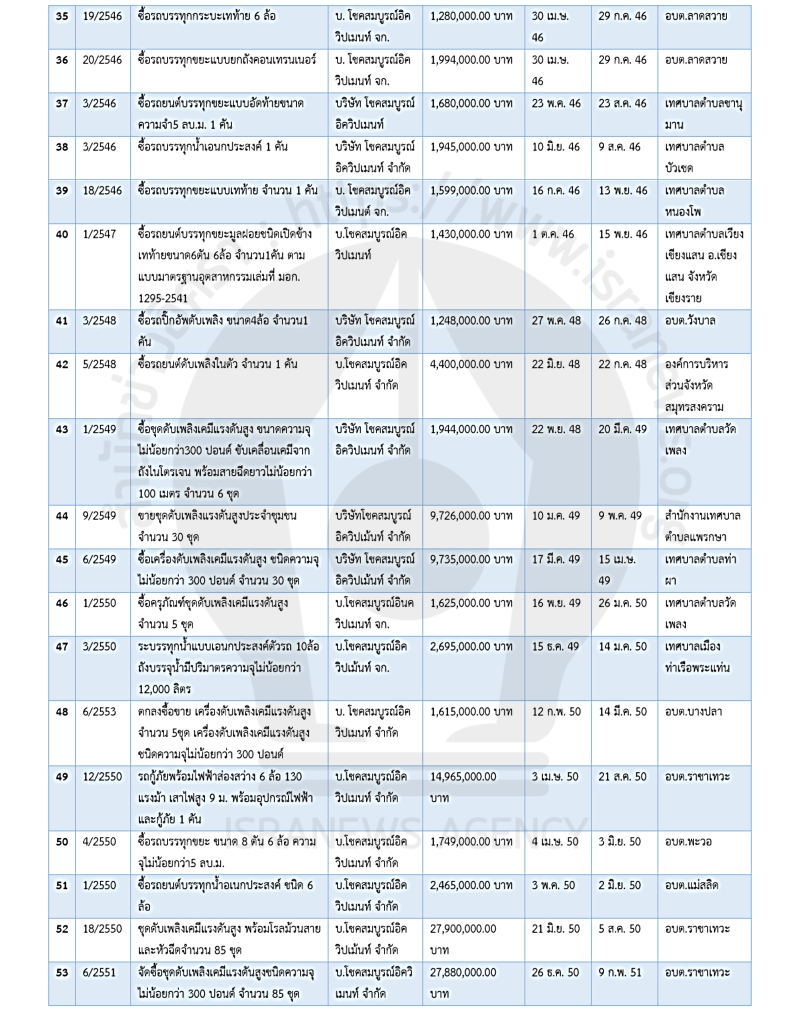 "...ช่วงปี 2547 บริษัท ศศิมา แอนด์ เพิ่มพูล จำกัด ปรากฏชื่อเป็นคู่สัญญาขายรถกู้ภัยให้กับเทศบาลตำบลบางเสาธง อ.บางพลี จ.สมุทรปราการ 1 สัญญา วงเงิน 5,995,000 บาท ช่วงปี 2547-2550 บริษัท เจริญสุขถาวร จำกัด ปรากฏชื่อเป็นคู่สัญญาหน่วยงานองค์การปกครองส่วนท้องถิ่นต่าง ๆ จำนวน 24 สัญญา วงเงินรวม 77,431,000 บาท ช่วงปี 2542-2562 บริษัท โชคสมบูรณ์ อิควิปเมนต์ จำกัด ปรากฏชื่อเป็นคูสัญญาองค์การปกครองส่วนท้องถิ่นต่าง ๆ จำนวน 94 สัญญา วงเงินรวม 562,745,400 บาท..."