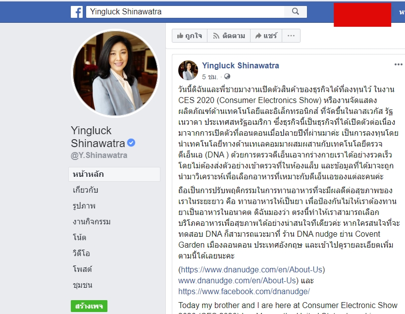เบื้องต้น สำนักข่าวอิศรา www.isranews.org ได้สืบข้อมูลธุรกิจการสกัดดีเอ็นเอ ของ น.ส.ยิ่งลักษณ์ ตามลิงค์ที่แจ้งไว้ใน เฟซบุ๊กส่วนตัวดังกล่าว (https://www.dnanudge.com/en/About-Us) พบว่า เป็นลิงค์เว็บไซต์บริษัท DNA Nudge ที่ขายสินค้าประเภทการระบุตัวดีเอ็นเอของเจ้าของ เพื่อให้เจ้าของผลิตภัณฑ์ดำเนินกิจกรรมในชีวิตต่างๆให้เหมาะสมกับดีเอ็นเอของตัวเอง