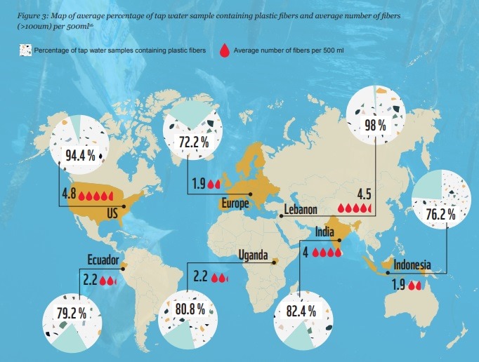 นักวิจัยได้สุ่มตัวอย่าง น้ำดื่มที่วางจำหน่ายในหลายพื้นที่ทั่วโลก พบเส้นใยพลาสติกขนาดจิ๋วในน้ำดื่มชนิดขวดขนาด 500 มิลลิลิตรที่วางจำหน่ายในอินเดีย และสหรัฐอเมริกา มากกว่าพื้นที่อื่นๆ ถึง 2 เท่า ขณะที่ยุโรป และอินโดนีเซีย พบพลาสติกในน้ำประปา