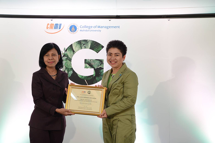 นางกลอยตา ณ ถลาง ผู้อำนวยการอาวุโส ฝ่ายบริหารภาพลักษณ์และสื่อสารองค์กร บริษัท บางจาก คอร์ปอเรชั่น จำกัด (มหาชน) เป็นผู้แทนบริษัทฯ รับมอบรางวัล Green Brand Love แบรนด์ที่ได้รับความเชื่อมั่นผลจากการสำรวจผู้บริโภคทั่วประเทศประมาณ 1,300 คน ด้วยเป็นองค์กรที่มีการดำเนินธุรกิจที่มีความรับผิดชอบต่อสังคมและสิ่งแวดล้อม ใช้ทรัพยากรอย่างคุ้มค่าด้วยระบบเศรษฐกิจหมุนเวียน ยึดหลักสร้างความสมดุลทางเศรษฐกิจ สังคม และสิ่งแวดล้อม เพื่อการเติบโตตามเป้าหมายการพัฒนาที่ยั่งยืน ในงานสัมมนาทางการตลาด ภายใต้หัวข้อ Voice of Green : เพื่อโลก เพื่อเรา ของวิทยาลัยการจัดการ มหาวิทยาลัยมหิดล (CMMU) ที่จัดต่อเนื่องเป็นประจำทุกปี โดยมีบุคคลทั่วไป องค์กรธุรกิจ รวมถึงสื่อมวลชนร่วมงานเป็นจำนวนมาก ณ CMMU ถนนวิภาวดีรังสิต