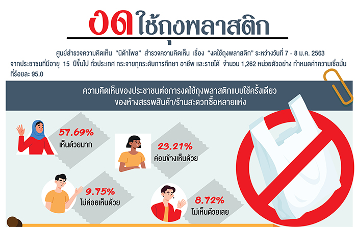 นิด้าโพลเผยความคิดเห็นของประชาชนการงดใช้ถุงพลาสติกแบบใช้ครั้งเดียว ของห้างสรรพสินค้า/ร้านสะดวกซื้อ หลายแห่ง ร้อยละ 57.69 ระบุว่า เห็นด้วยมาก เพราะ เป็นการช่วยลดขยะในประเทศ แนะ ควรมีถุงกระดาษหรือถุงผ้ามือสองทดแทนในกรณีที่ลูกค้าลืมเตรียมถุงมา