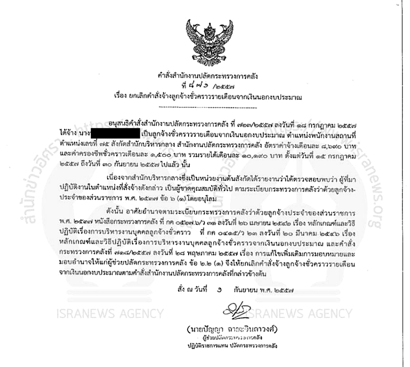 เมื่อตรวจสอบหนังสือ คำสั่งสำนักงานปลัดกระทรวงการคลังเลขที่ 871/2557 เรื่อง ยกเลิกคำสั่งจ้างลูกจ้างชั่วคราวรายเดือนจากเงินนอกงบประมาณ ระบุว่า จากอนุสนธิตำสั่งสำนักงานปลัดกระทรวงการคลัง ที่ 323/2557 ลงวันที่ 18 ก.ค. 2557 ได้จ้าง นาง ก (นามสมมติ) เป็นลูกจ้างชั่วคราวรายเดือนนอกเงินงบประมาณ ไปแล้วนั้น