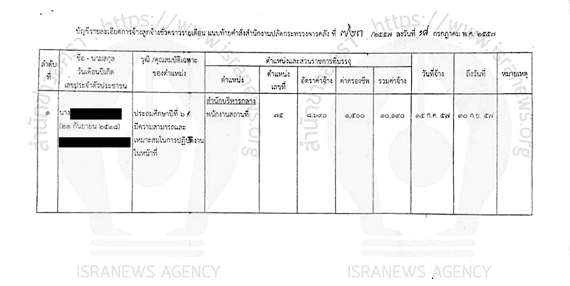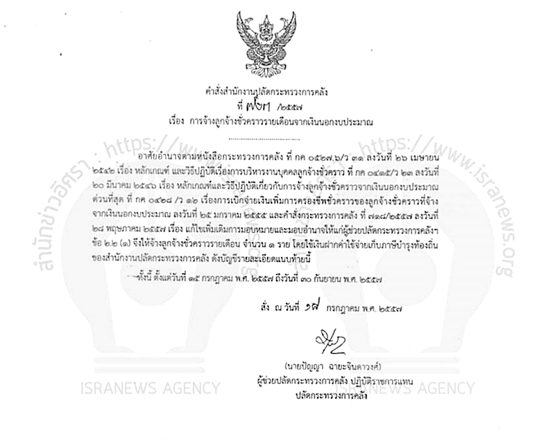 ขณะที่ สำนักข่าวอิศราตรวจสอบ พบว่า กระทรวงการคลังได้จ้าง นาง ก (นามสมติ) เข้าทำงานเป็นลูกจ้างชั่วคราวรายเดือนในตำแหน่งพนักงานสถานที่ ช่วงวันที่ 15 ก.ค. 2557 ถึงวันที่ 30 ก.ย. 2557 โดยปรากฏในรายละเอียดใน หนังสือคำสั่งสำนักงานปลัดกระทรวงการคลัง ที่ 323/2557 ลงวันที่ 18 ก.ค. 2557 ลงวันที่ 18 ก.ค. 2557 เรื่อง การจ้างลูกจ้างชั่วคราวรายเดือนจากเงินนอกงบประมาณ โดย นายปัญญา ฉายะจินดาวงศ์ ผู้ช่วยปลัดกระทรวงการคลัง ปฏิบัติราชการแทนปลัดกระทรวงการคลัง ลงนามท้ายหนังสือ ระบุว่า ได้จ้างลูกจ้างชั่วคราวรายเดือน จำนวน 1 ราย โดยใช้เงินฝากค่าใช้จ่ายเก็บภาษีบำรุงท้องถิ่นของสำนักงานปลัดกระทรวงการคลัง คือ นาง ก (นามสมมติ) เกิดเมื่อวันที่ 21 ก.ย. 2538 วุฒิการศึกษาชั้นประถมศึกษาปีที่ 6 ในตำแหน่ง พนักงานสถานที่ รวมค่าจ้าง 10,190 บาท จ้างตั้งแต่ช่วงวันที่ 15 ก.ค. 2557 ถึงวันที่ 30 ก.ย. 2557 (ดูเอกสารประกอบ)