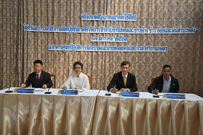 กรมวิชาการเกษตร ผสานความร่วมมือ 4 ผู้ประกอบการภาคเอกชน ร่วมลงนามสัญญาอนุญาตให้ใช้สิทธิ “สูตรและกรรมวิธีการผลิตปุ๋ยชีวภาพพีจีพีอาร์ สำหรับข้าวโพดและข้าวฟ่าง” “สูตรและกรรมวิธีการผลิตปุ๋ยชีวภาพพีจีพีอาร์ สำหรับข้าว” และ “สูตรและกรรมวิธีการผลิตปุ๋ยชีวภาพพีจีพีอาร์ สำหรับอ้อยและมันสำปะหลัง” เน้นถ่ายทอดข้อมูลองค์ความรู้งานวิจัยด้านการเกษตร มุ่งพัฒนาขยายผลงานวิจัยปรับใช้ประโยชน์เชิงพาณิชย์ เพื่อยกระดับการผลิตผลิตภัณฑ์ปุ๋ยชีวภาพที่มีคุณภาพได้มาตรฐาน มีราคาถูก และยังเป็นประโยชน์ในการช่วยยกระดับภาคการเกษตรและเศรษฐกิจของไทย พร้อมสร้างความเข้มแข็งภาคการเกษตรก้าวสู่ไทยแลนด์ 4.0