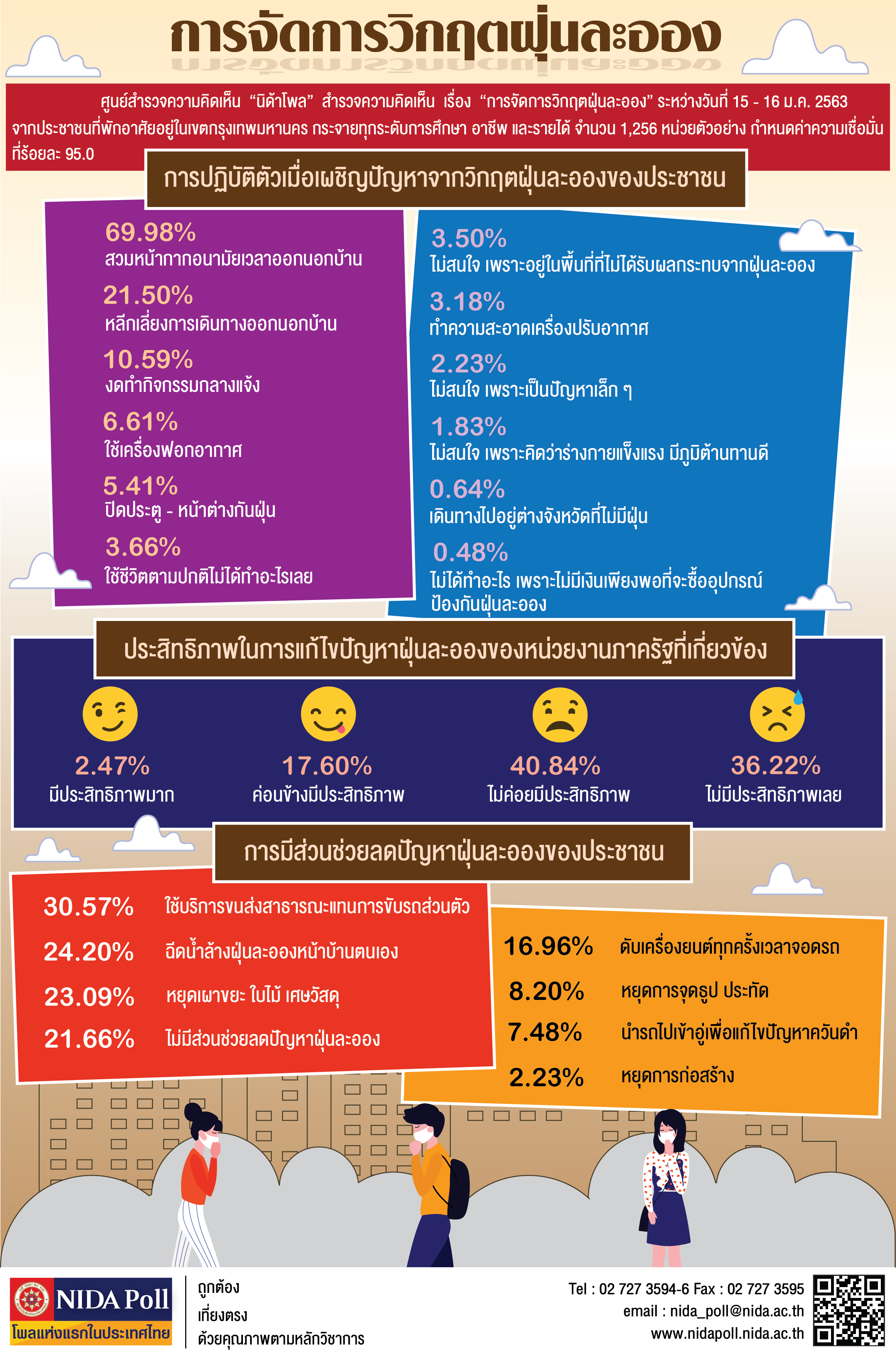 ศูนย์สำรวจความคิดเห็น “นิด้าโพล” สถาบันบัณฑิตพัฒนบริหารศาสตร์ (นิด้า) เปิดเผยผลสำรวจของประชาชน เรื่อง “การจัดการวิกฤตฝุ่นละออง” ทำการสำรวจระหว่างวันที่ 15 – 16 ม.ค. 2563 จากประชาชนที่พักอาศัยอยู่ในเขตกรุงเทพมหานคร