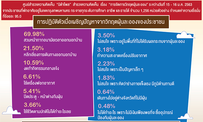 จากการสำรวจเมื่อถามถึงการปฏิบัติตัวเมื่อเผชิญปัญหาจากวิกฤตฝุ่นละอองของประชาชน พบว่า ส่วนใหญ่ ร้อยละ 69.98 ระบุว่า สวมหน้ากากอนามัยเวลาออกนอกบ้าน รองลงมา ร้อยละ 21.50 ระบุว่า หลีกเลี่ยงการเดินทางออกนอกบ้าน ร้อยละ 10.59 ระบุว่า งดทำกิจกรรมกลางแจ้ง ร้อยละ 6.61 ระบุว่า ใช้เครื่องฟอกอากาศ ร้อยละ 5.41 ระบุว่า ปิดประตู-หน้าต่างกันฝุ่น ร้อยละ 3.66 ระบุว่า ใช้ชีวิตตามปกติไม่ได้ทำอะไรเลย ร้อยละ 3.50 ระบุว่า ไม่สนใจ เพราะอยู่ในพื้นที่ที่ไม่ได้รับผลกระทบจากฝุ่นละออง ร้อยละ 3.18 ระบุว่า ทำความสะอาดเครื่องปรับอากาศ ร้อยละ 2.23 ระบุว่า ไม่สนใจ เพราะเป็นปัญหาเล็ก ๆ ร้อยละ 1.83 ระบุว่า ไม่สนใจ เพราะคิดว่าร่างกายแข็งแรง มีภูมิต้านทานดี ร้อยละ 0.64 ระบุว่า เดินทางไปอยู่ต่างจังหวัดที่ไม่มีฝุ่น ร้อยละ 0.48 ระบุว่า ไม่ได้ทำอะไร เพราะไม่มีเงินเพียงพอที่จะซื้ออุปกรณ์ป้องกันฝุ่นละออง และร้อยละ 0.32 ระบุอื่น ๆ ได้แก่ ปลูกต้นไม้ ฉีดน้ำบริเวณรอบบ้าน ขณะที่บางส่วนระบุว่า ซื้อเครื่องตรวจจับค่า pm 2.5 มาใช้