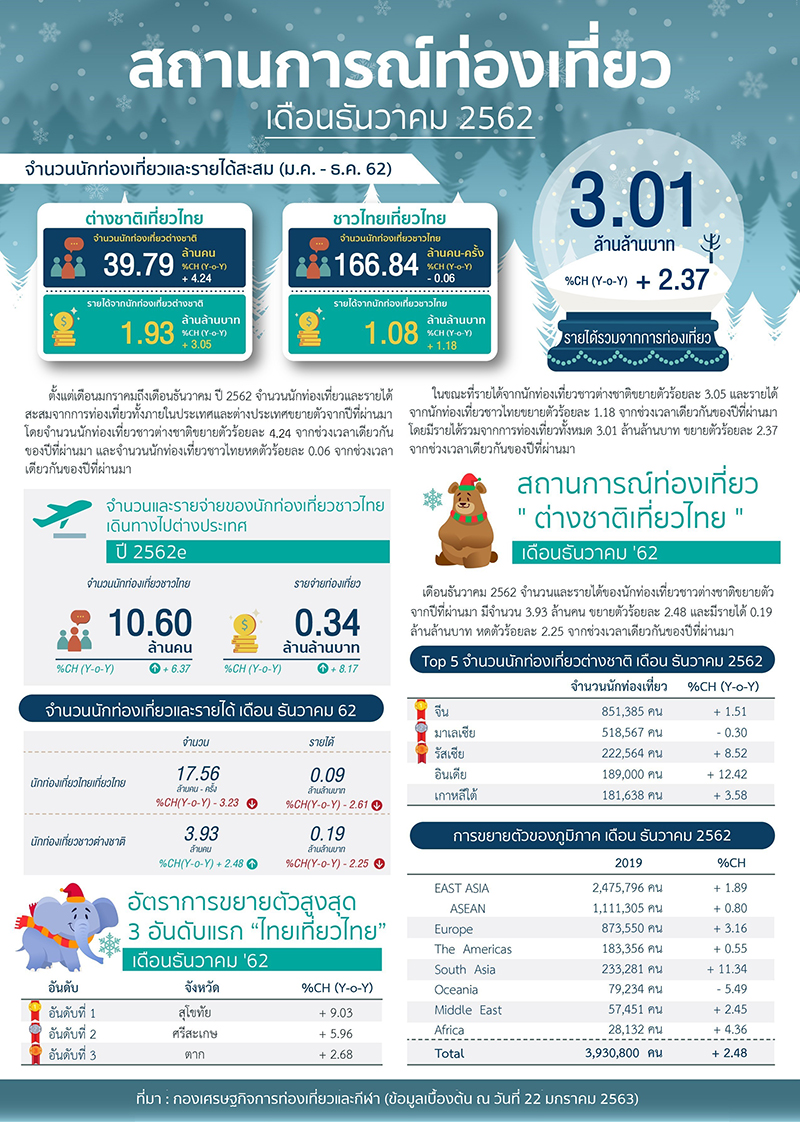 รายงานข่าวแจ้งว่า แม้ว่าทั้งปี 2562 จำนวนนักท่องเที่ยวต่างชาติจะเติบโตต่อเนื่อง แต่เมื่อพิจาณาจากจำนวนนักท่องเที่ยวต่างชาติในเดือนธ.ค.2562 จะพบว่านักท่องเที่ยวชาวจีนอยู่ที่ 8.51 แสนคน เพิ่มขึ้นเพียง 1.51% เมื่อเทียบกับช่วงเดียวกันของปีก่อน จากเดือนพ.ย.2562 ที่จำนวนนักท่องเที่ยวจีนเติบโต 18.33% และเดือนต.ค.2562 ที่เติบโต 27.81% ส่งผลให้ทั้งปี 2562 นักท่องเที่ยวจีนอยู่ที่ 10.99 ล้านคน เพิ่มขึ้น 4.36% สร้างรายได้เข้าประเทศ 5.43 แสนล้านบาท เพิ่มขึ้น 4.78%