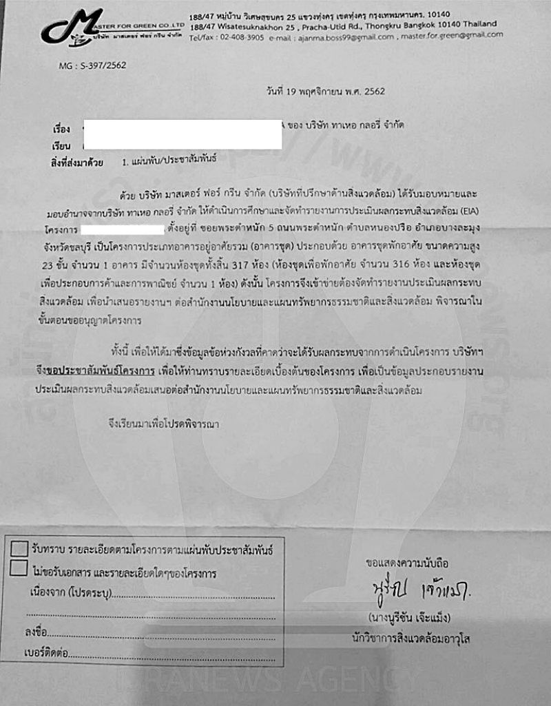 ขณะที่ สำนักข่าวอิศรา ตรวจสอบพบว่า ก่อนหน้านี้ นางนูรีชัน เจ๊ะแม็ง นักวิชาการสิ่งแวดล้อมอาวุโส บริษัท มาสเตอร์ ฟอร์ กรีน จำกัด ได้ทำหนังสือชี้แจงผู้ร้องเรียนรายหนึ่ง ถึงข้อกังวลเรื่องผลกระทบโครงการ ระบุว่า บริษัท มาสเตอร์ ฟอร์ กรีน จำกัด ได้รับมอบหมายจาก บริษัท ทาเหอ กลอรี่ จำกัด ให้ดำเนินการศึกษาและจัดทำรายงานการประเมินผลกระทบสิ่งแวดล้อม (EIA) โครงการดังกล่าว เพื่อนำเสนอต่อสำนักงานนโยบายและแผนทรัพยากรธรรมชาติและสิ่งแวดล้อม พิจารณาในขั้นตอนขออนุญาตโครงการ โดยโครงการตั้งอยู่ที่ ซอยพระตำหนัก 5 ถนนพระตำหนัก ต.หนองปลือ อ.บางละมุง จ.ชลบุรี เป็นโครงการประเภทอาคารอยู่อาศัยรวม (อาคารชุด) ความสูง 23 ชั้น มีจำนวนห้องชุดทั้งสิ้น 317 ห้อง ห้องชุดเพื่อพักอาศัย จำนวน 316 ห้อง และห้องชุดเพื่อประกอบการค้าและพาณิชย์ จำนวน 1 ห้อง)