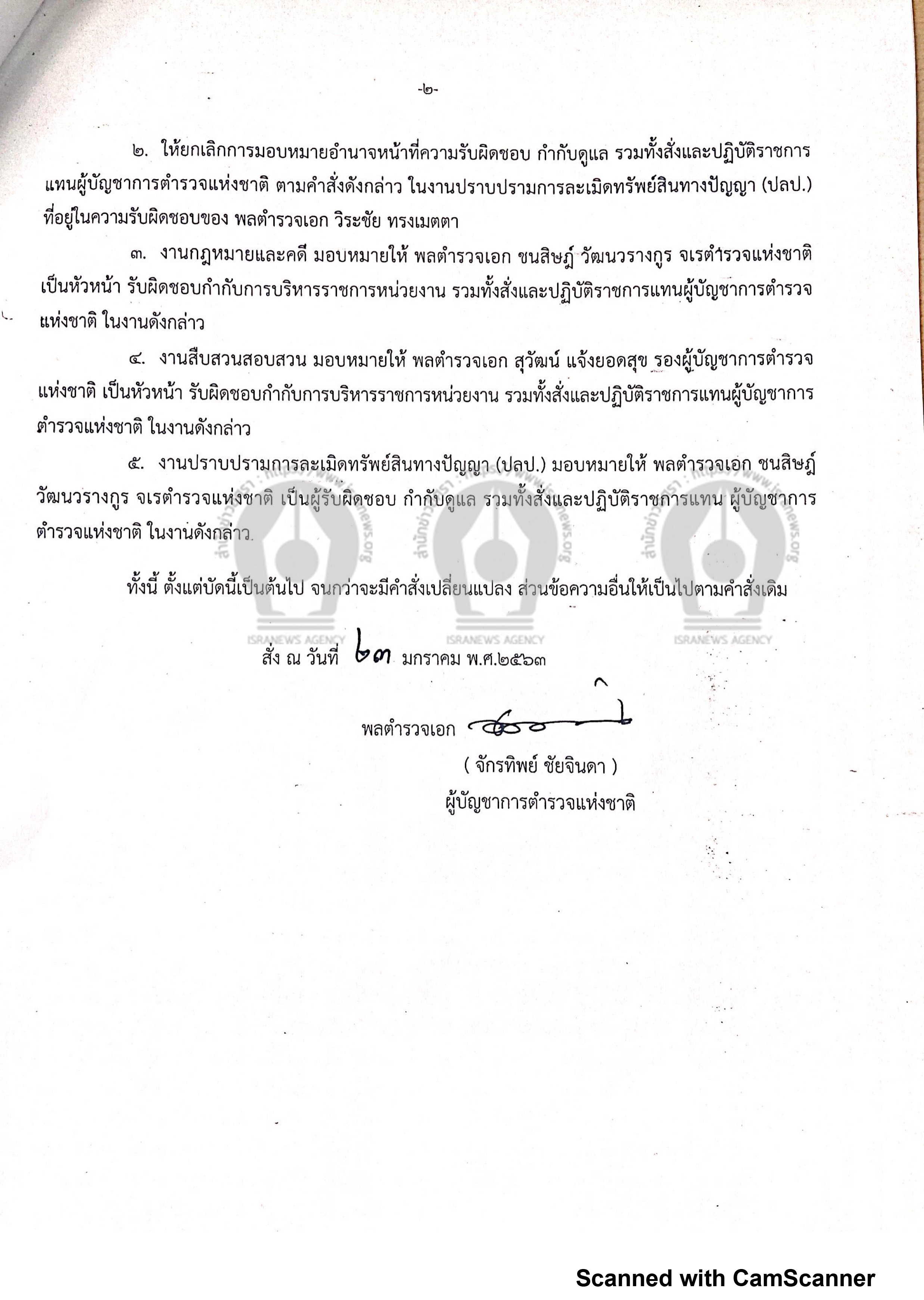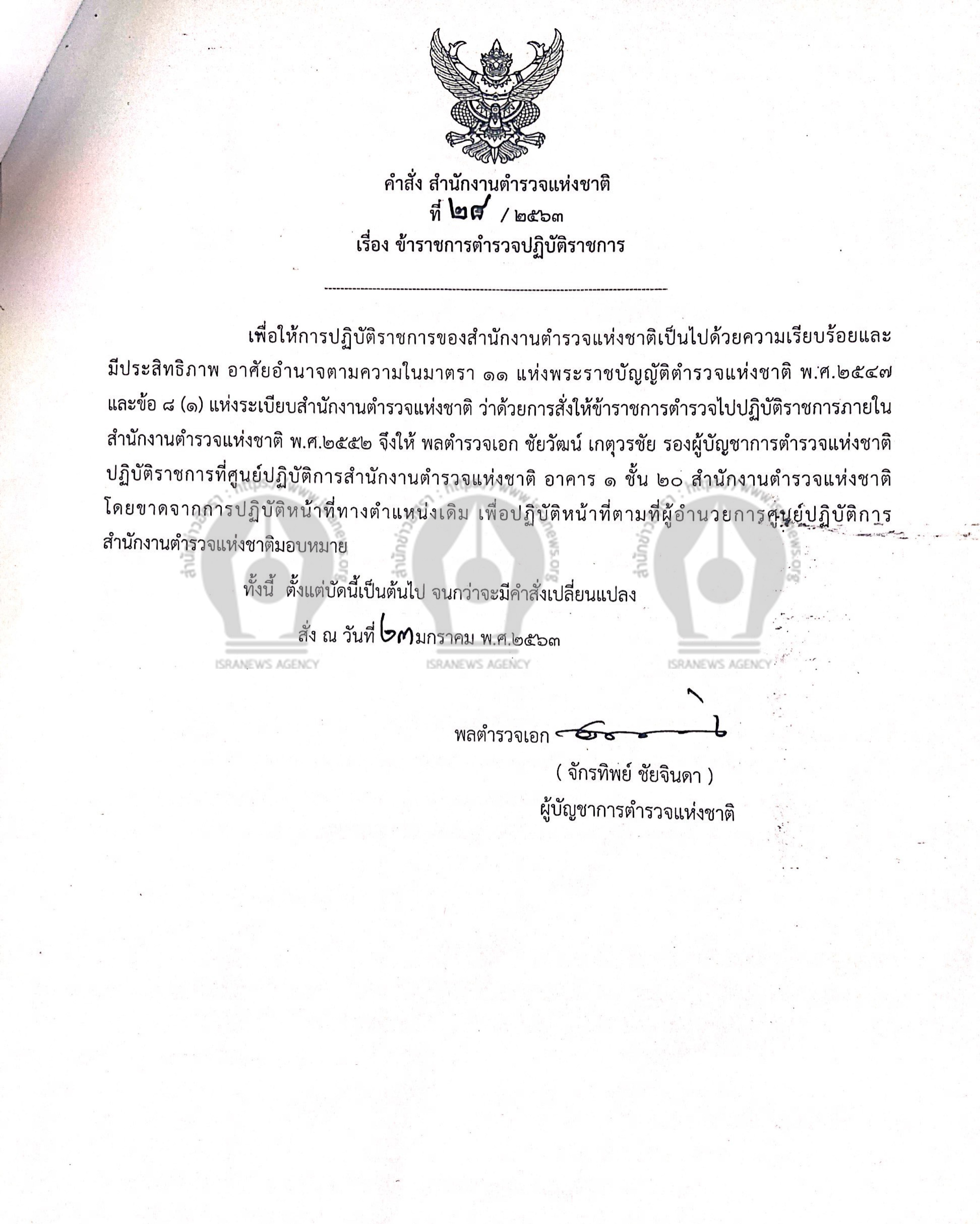 จากนั้นในช่วงบ่าย วันที่ 24 ม.ค.2563 ก็มีข่าวปรากฎว่า พล.ต.อ.จักรทิพย์ ชัยจินดา ผู้บัญชาการตำรวจแห่งชาติ (ผบ.ตร.) มีคำสั่งสำนักงานตำรวจแห่งชาติ ที่ 28/2563 ลงวันที่ 23 ม.ค. เรื่องข้าราชการตำรวจปฎิบัติราชการ ใจความว่า เพื่อให้การปฎิบัติราชการของสำนักงานตำรวจแห่งชาติ เป็นไปด้วยความเรียบร้อยและมีประสิทธิภาพ