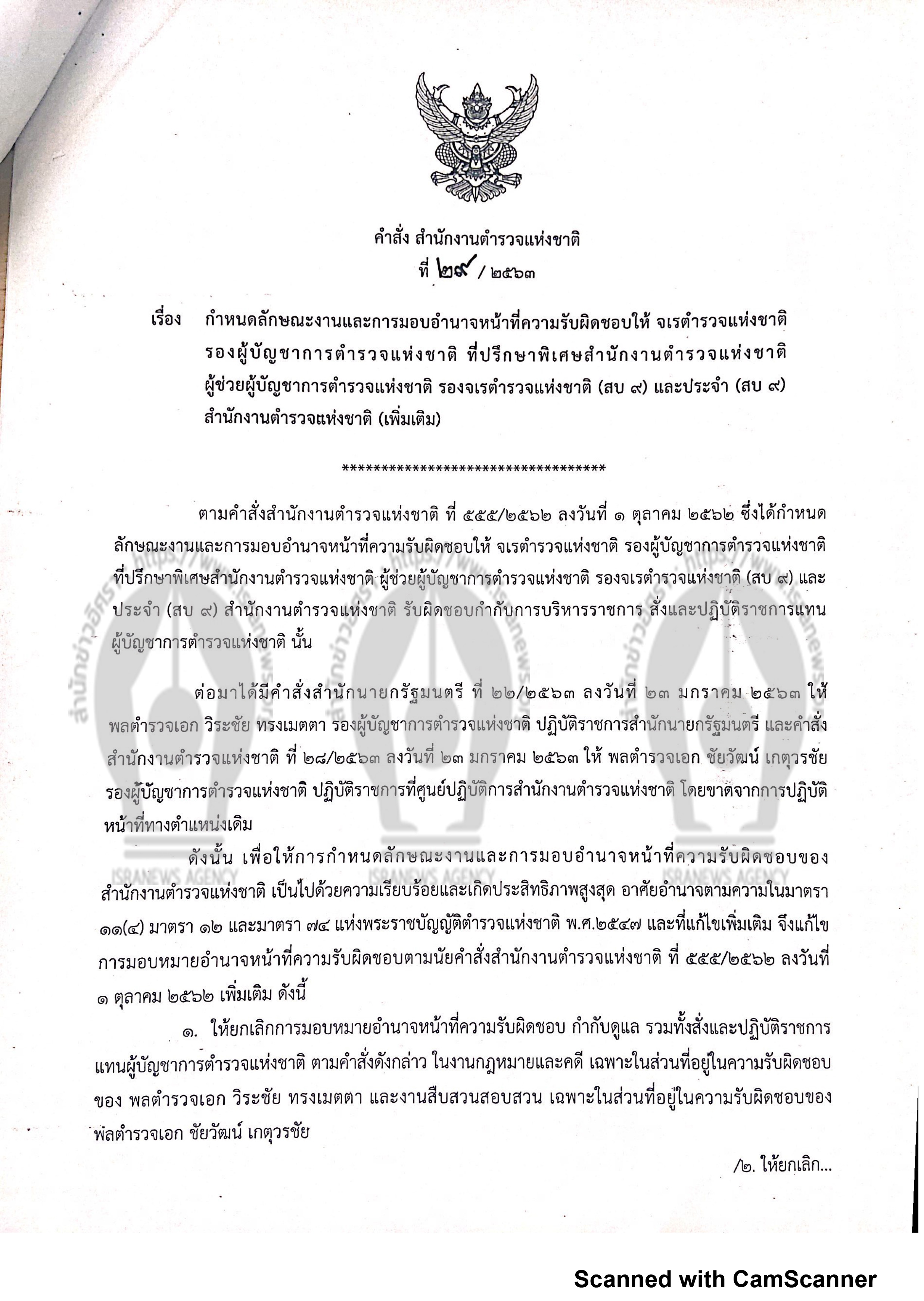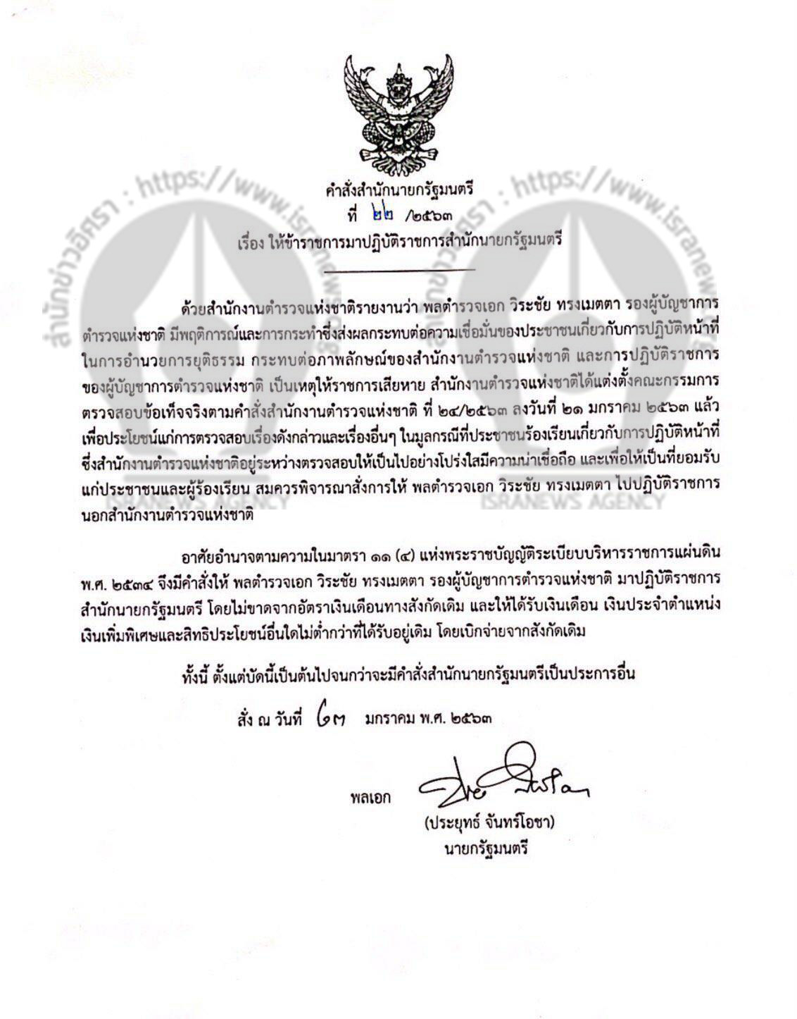 "... ล่าสุด มีการเผยแพร่คำสั่งสำนักงานตำรวจแห่งชาติ ฉบับใหม่ ระบุเรื่องการกำหนดลักษณะงาน และการมอบอำนาจหน้าที่ความรับผิดชอบให้ จเรตำรวจแห่งชาติ รองผู้บัญชาการตำรวจแห่งชาติ ที่ปรึกษาพิเศษสำนักงานตำรวจแห่งชาติ ผู้ช่วยผู้บัญชาการตำรวจแห่งชาติ รองเจรตำรวจแห่งชาติ ซึ่งมีการระบุถึงข้อมูลคำสั่งย้าย พล.ต.อ.วิระชัย ทรงเมตตา รองผู้บัญชาการตำรวจแห่งชาติ มาปฏิบัติราชการสำนักนายกรัฐมนตรี และ พล.ต.อ.ชัยวัฒน์ เกตุวรชัย รองผู้บัญชาการตำรวจแห่งชาติ ปฎิบัติราชการที่ศูนย์ปฎิบัติการสำนักงานตำรวจแห่งชาติ มาใช้ประกอบในการออกคำสั่งฉบับนี้ ด้วย ..."
