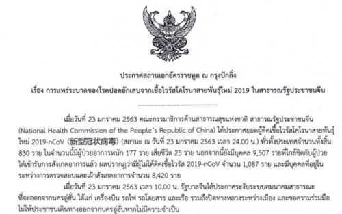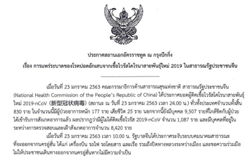 สถานทูตไทย ณ กรุงปักกิ่ง ขอให้คนไทยในจีนเกาะติดข่าวไวรัสโคโรนา ระบาที่อู่ฮั่น -ยอดผู้ติดเชื้อพุ่ง 830 ราย เสียชีวิต 25 รายแล้ว