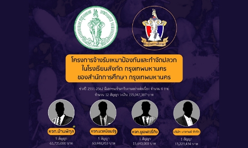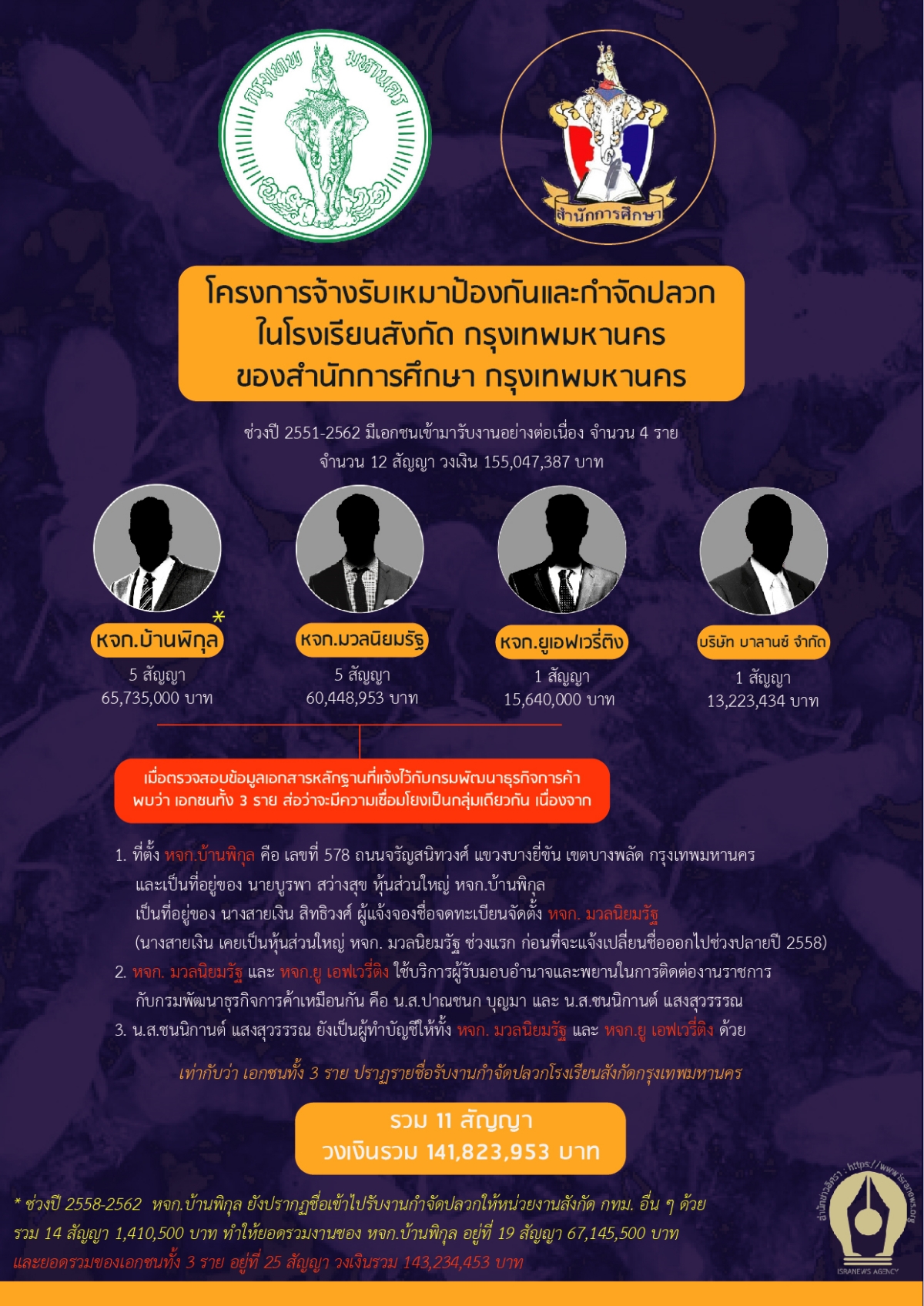 “...ข้อมูลเชิงลึกกลุ่มเอกชน 3 ราย คือ หจก. มวลนิยมรัฐ หจก.บ้านพิกุล และ หจก.ยู เอฟเวรี่ติง ที่ปรากฏชื่อเข้ามารับงานจ้างรับเหมาป้องกันและกำจัดปลวกภายในโรงเรียนสังกัดกรุงเทพมหานคร ของสำนักการศึกษา กรุงเทพมหานคร (กทม.) นับตั้งแต่ปี 2551 - ปัจจุบัน จำนวนรวม 25 สัญญา วงเงินรวม 143,234,453 บาท ซึ่งเป็นการจัดซื้อจัดจ้างแบบเสนอราคาทางอิเล็กทรอนิกส์ 11 สัญญา วิธีเฉพาะเจาะจง 7 สัญญาวิธีการตกลงราคา 7 สัญญา พบว่า อาจจะมีความเชื่อมโยงเป็นกลุ่มเดียวกัน...”