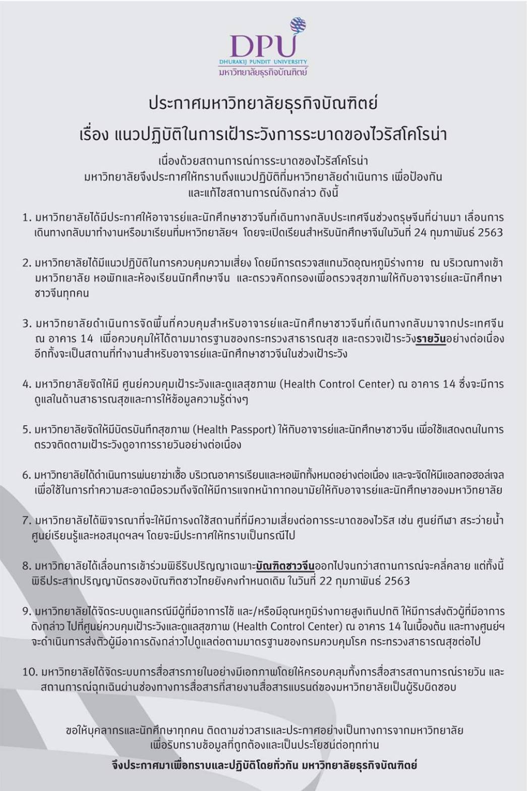 สำนักข่าวอิศรา www.isranews.org รายงานว่าเมื่อวันที่ 27 ม.ค. มหาวิทยาลัยธุรกิจบัณฑิตย์ (มธบ.) ได้ออกประกาศแนวปฏิบัติในการเฝ้าระวังการระบาดของไวรัสโคโรน่า โดยให้อาจารย์มหาวิทยาลัยและนักศึกษาชาวจีนที่ได้เดินทางกลับไปประเทศจีนเลื่อนการเดินทางกลับประเทศไทย อันเนื่องมาจากสถานการณ์การระบาดของไวรัสโคโรน่า โดยจะเปิดเรียนนักศึกษาจีนในวันที่ 24 ก.พ. 2563 นี้