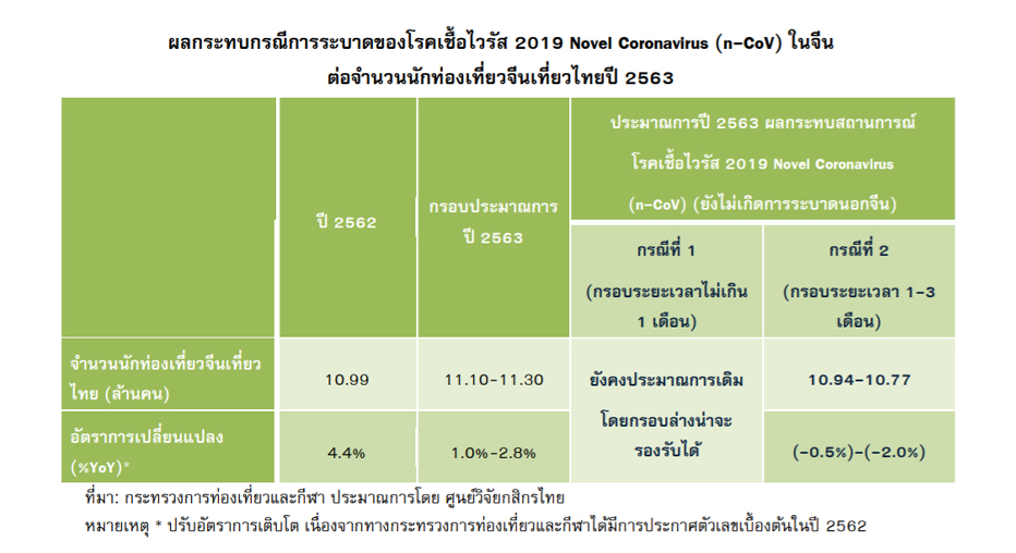 แต่ทว่าในมุมมองของ เชาว์ เก่งชน กรรมการผู้จัดการ บริษัท ศูนย์วิจัยกสิกรไทย จำกัด กลับมองต่างออกไป โดย เชาว์ กล่าวกับสำนักข่าวอิศรา ว่า หากการระบาดของโรคเกิดขึ้นเพียงสั้นๆ ไม่เกิน 1 เดือน จะไม่กระทบต่อประมาณการนักท่องเที่ยวจีนทั้งปี 2563 ที่คาดว่าจะอยู่ที่ 11.1-11.3 ล้านคน หรือเพิ่มขึ้น 1-2.8% จากปีที่แล้ว ส่วนในระยะสั้นคงจะผลกระทบบ้าง แต่จะเพิ่มขึ้นในระยะต่อไป