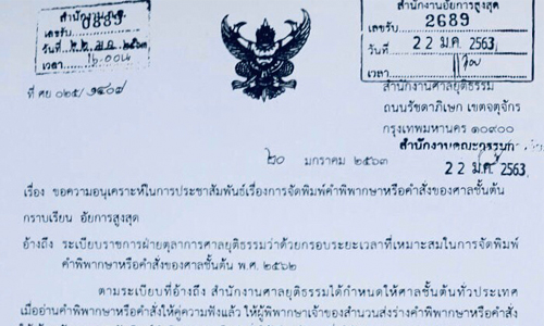 สำนักงานศาลยุติธรรม ส่งหนังสือถึง อสส. อ้างระเบียบฝ่ายตุลาการศาลฯ กำหนดให้ศาลชั้นต้นทั่วประเทศ เมื่ออ่านคำพิพากษา-คำสั่งแล้ว ต้องส่งร่างให้จัดพิมพ์ เพื่อให้คู่ความคัดถ่ายสำเนาได้ภายใน 10 วันทำการ
