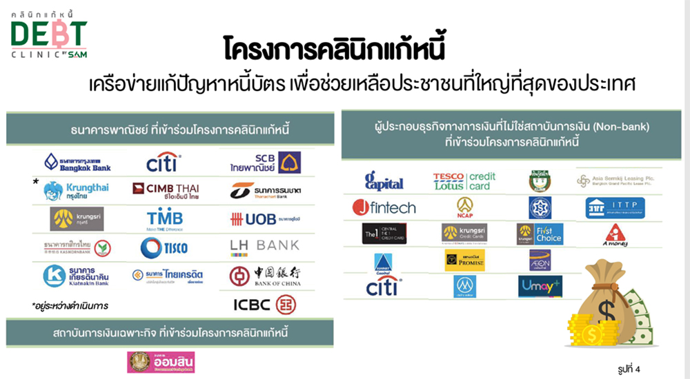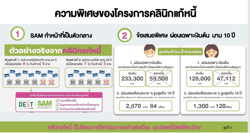 ทั้งนี้ ประชาชนที่สนใจ สามารถติดตามข่าวสารของโครงการฯ ได้ในหลายช่องทาง เช่น www.คลินิกแก้หนี้.com และ www.debtclinicbysam.com แอดไลน์ @debtclinicbysam Facebook คลินิกแก้หนี้ และ Debtclinicbysam หรือสอบถามข้อมูลเพิ่มเติมได้ที่ Call Center 02-610-2266 ทุกวัน