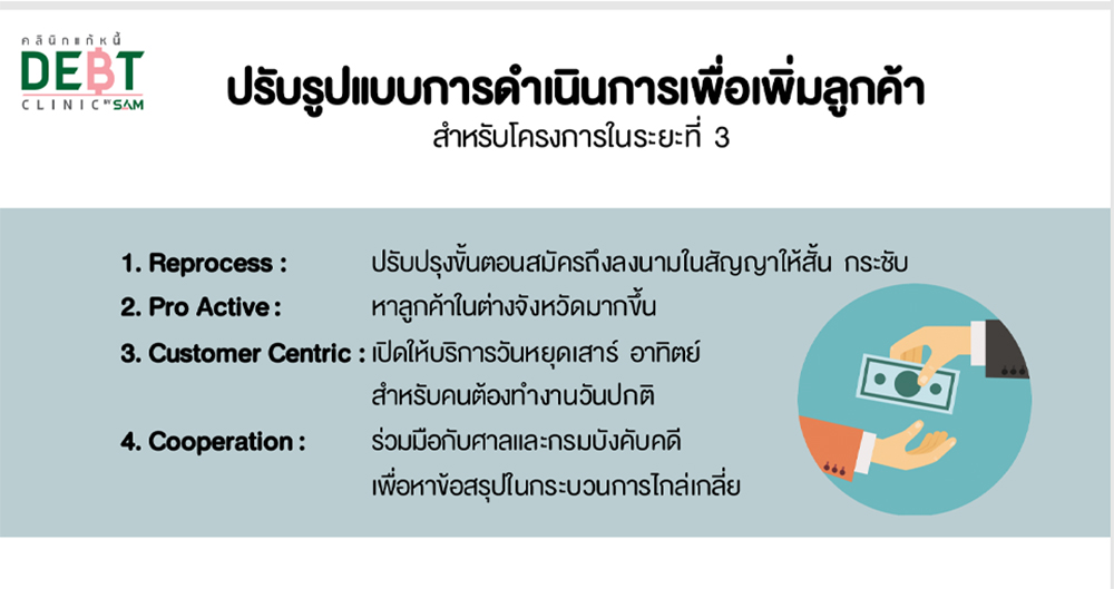 นอกจากนี้ โครงการฯระยะที่ 3 จะประสานความร่วมมือกับศาลและกรมบังคับคดีเพื่อหาข้อสรุปในขั้นตอนไกล่เกลี่ย ซึ่งจะช่วยเพิ่มจำนวนลูกค้าอีกทางหนึ่งด้วย