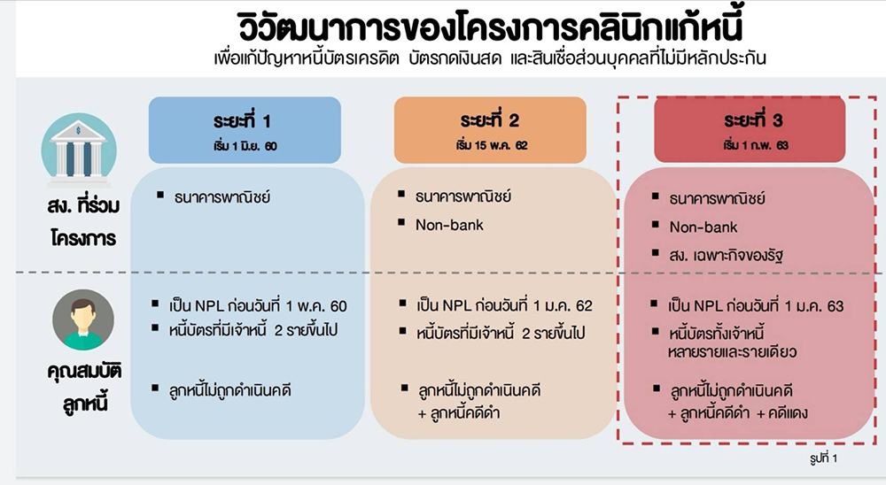 ขณะที่ปัจจุบันโครงการคลินิกแก้หนี้ได้เดินหน้าเข้าสู่ “ระยะที่ 3” แล้ว แต่โครงการฯระยะดังกล่าว จะขยายขอบเขตการแก้ปัญหาหนี้สินให้ลูกหนี้ โดยให้สามารถแก้ไขหนี้บัตรฯที่มีเจ้าหนี้รายเดียว และหนี้บัตรที่อยู่ในกระบวนการของศาลและมีคำพิพากษาแล้ว รวมทั้งปรับปรุงคุณสมบัติผู้เข้าโครงการฯ จากเดิมต้องมีหนี้บัตรฯที่เป็นหนี้เสีย (NPLs) ก่อน 1 ม.ค.2562 แต่ขณะนี้เปลี่ยนมาเป็นก่อนวันที่ 1 ม.ค.2563