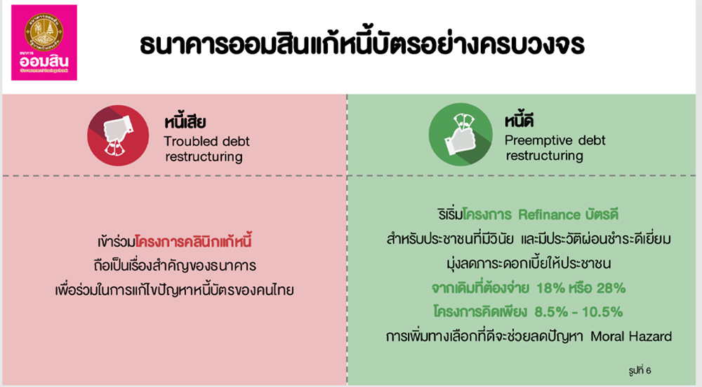 นอกจากนี้ ธนาคารยังได้เริ่มโครงการ refinance หนี้บัตรดีเพื่อลดภาระดอกเบี้ยให้แก่ประชาชนที่มีวินัยและมีประวัติการผ่อนชำระดีเยี่ยม ที่เดิมต้องจ่ายดอกเบี้ยสูง 18% หรือ 28% แต่โครงการนี้จะคิดอัตราดอกเบี้ยเพียง 8.50-10.50% ตามความเสี่ยง อีกทั้งจะสนับสนุนให้ลูกค้านำเงินที่ประหยัดได้ในแต่ละเดือนจากการ refinance ไปเก็บออมไว้ เช่นซื้อสลากออมสินด้วย